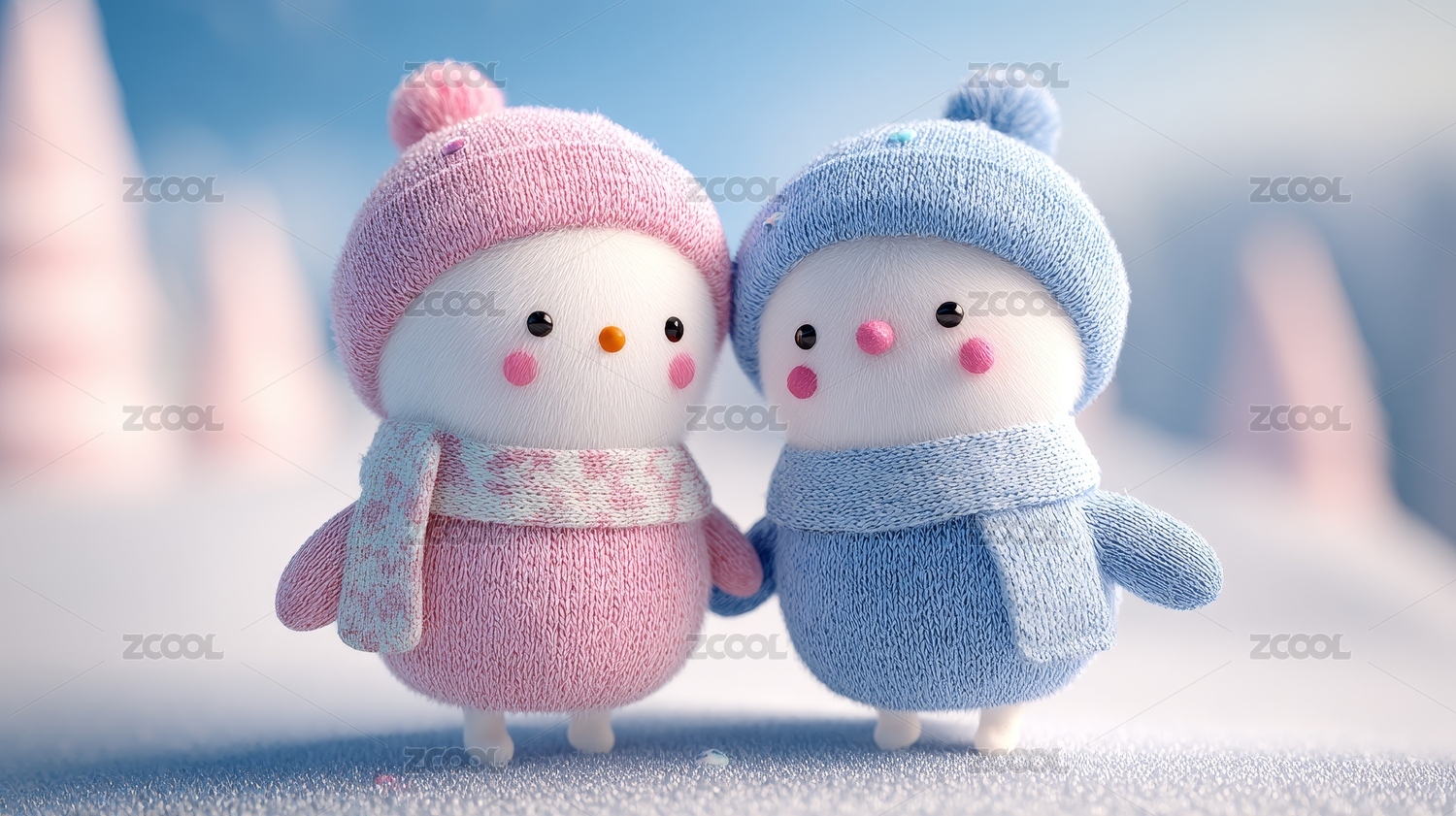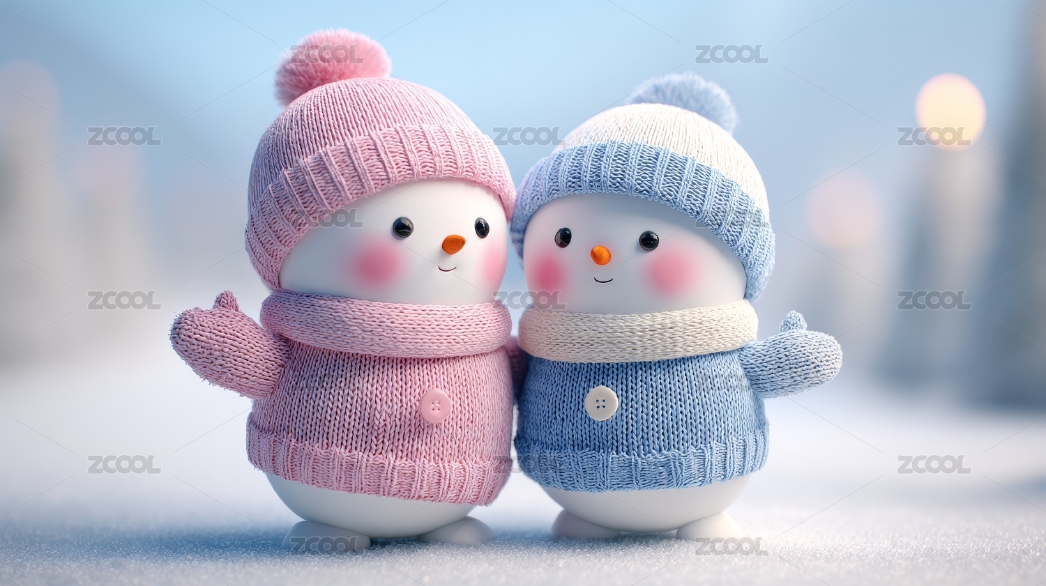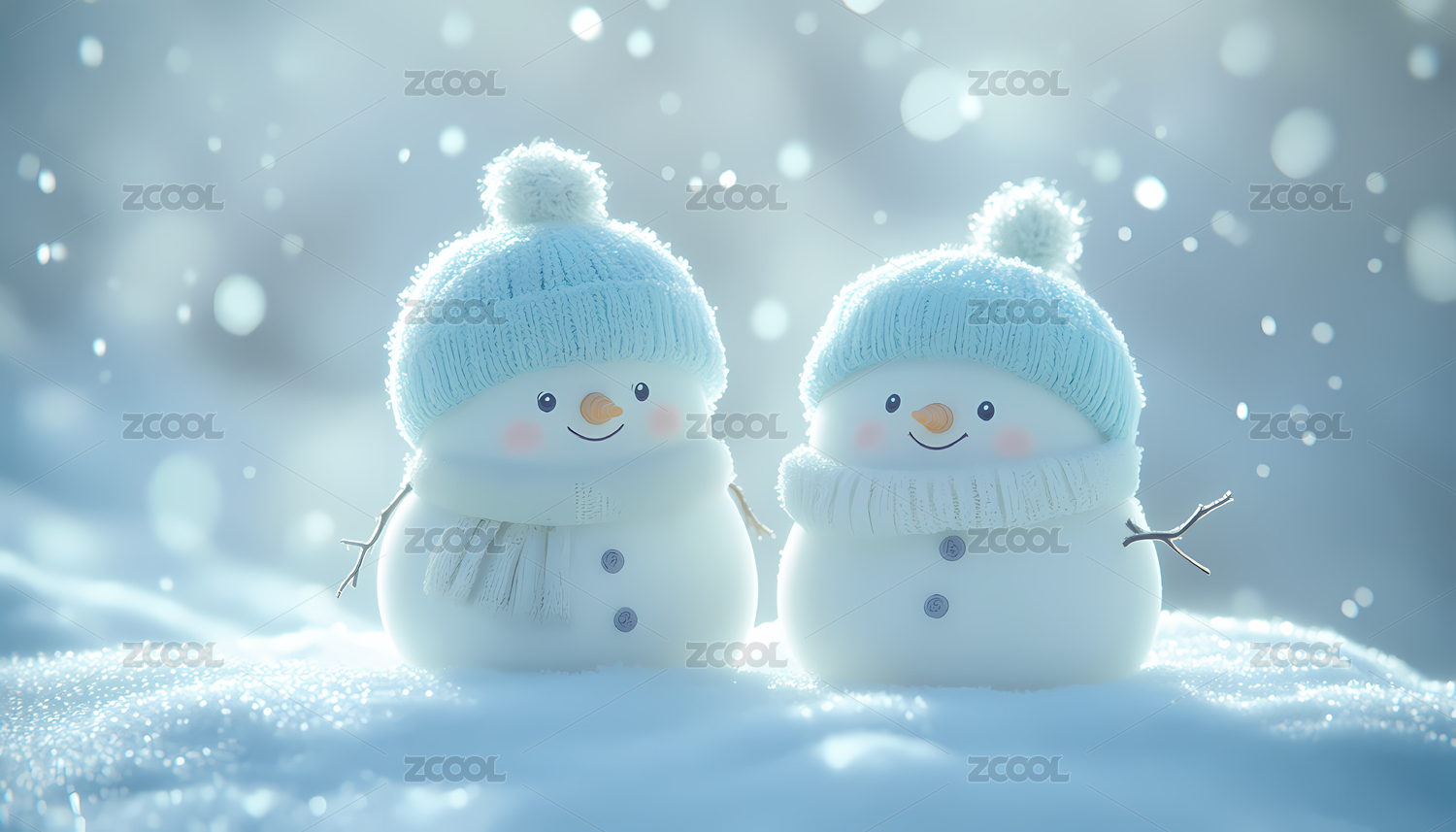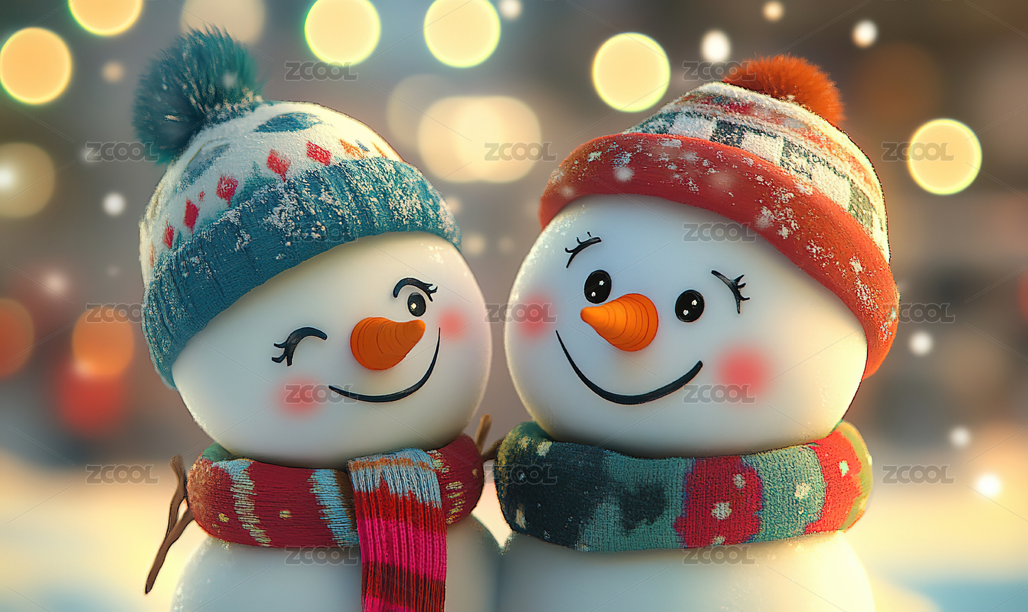 两个可爱的雪人玩偶在雪地场景中