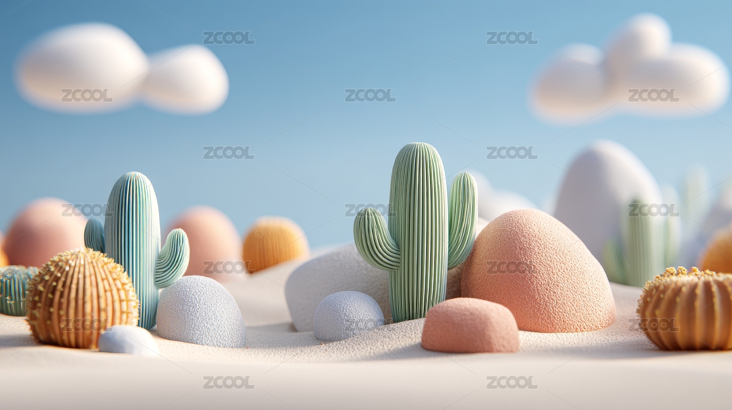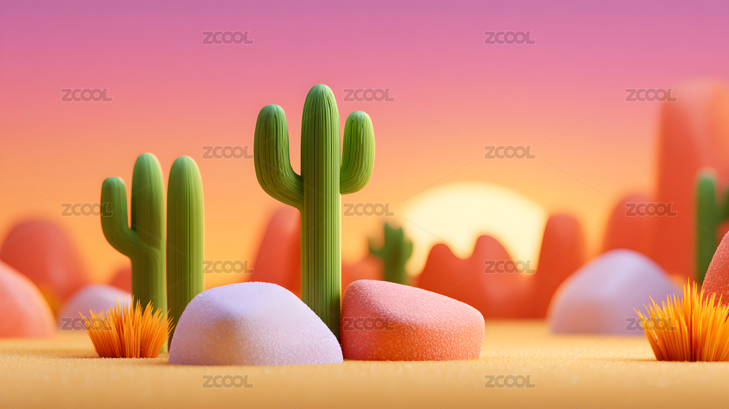 可爱3D渲染沙漠场景与仙人掌和彩色石头