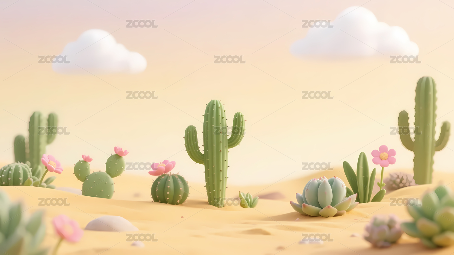 可爱的3D渲染沙漠场景与仙人掌和石头