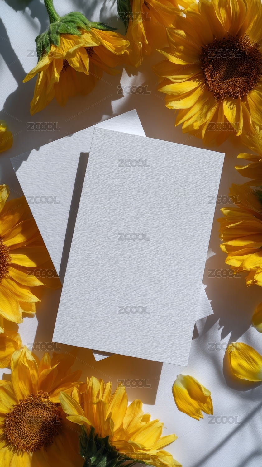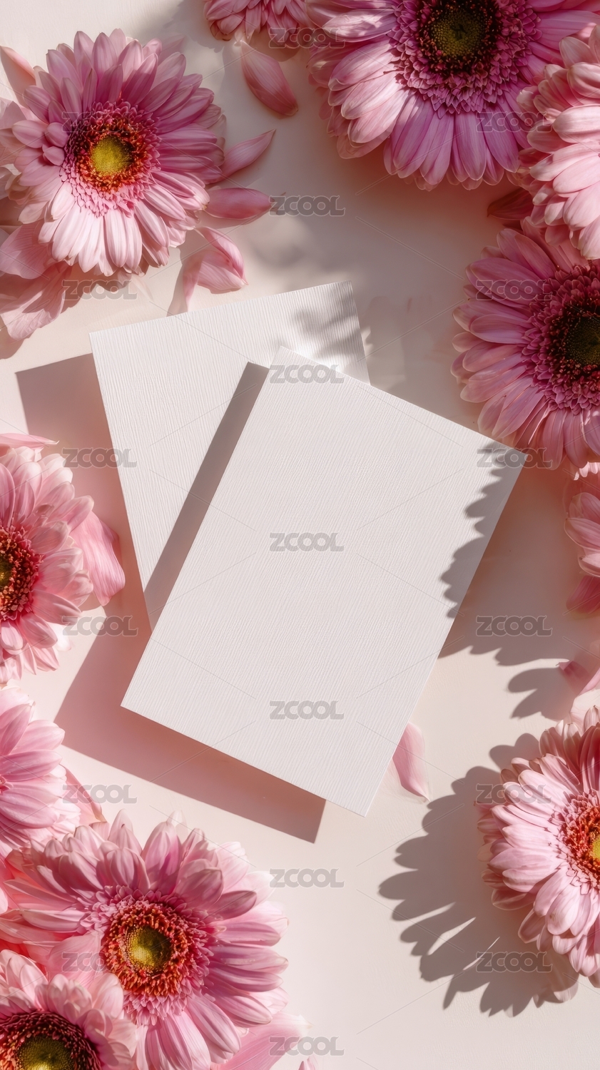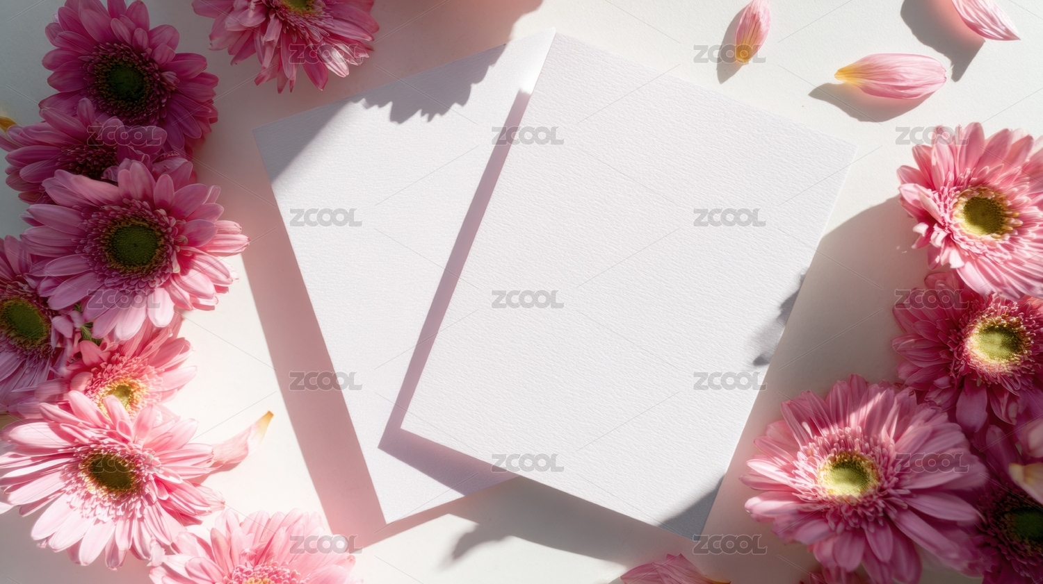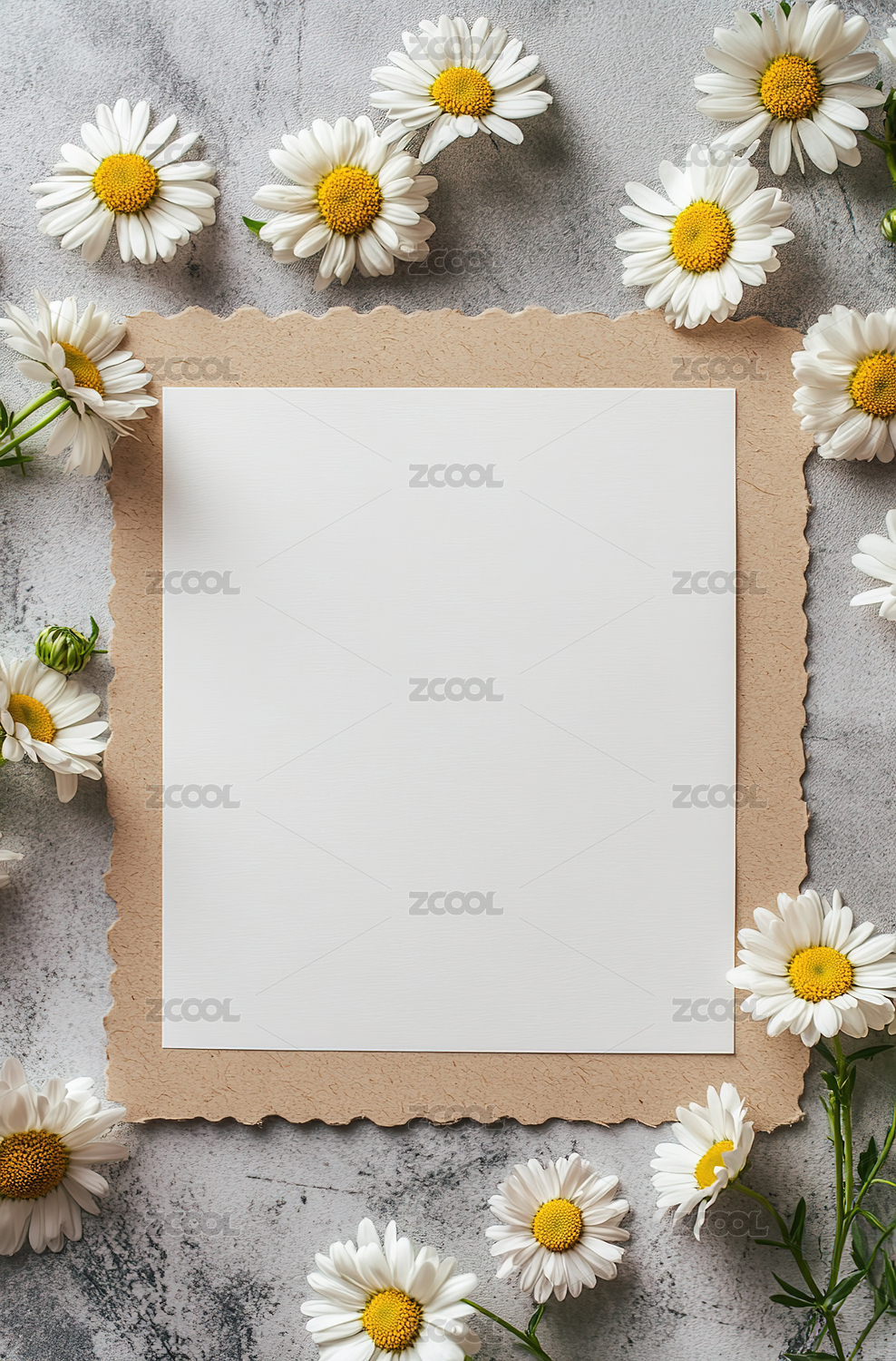 白色空白纸张与洋甘菊花瓣组成的自然画面