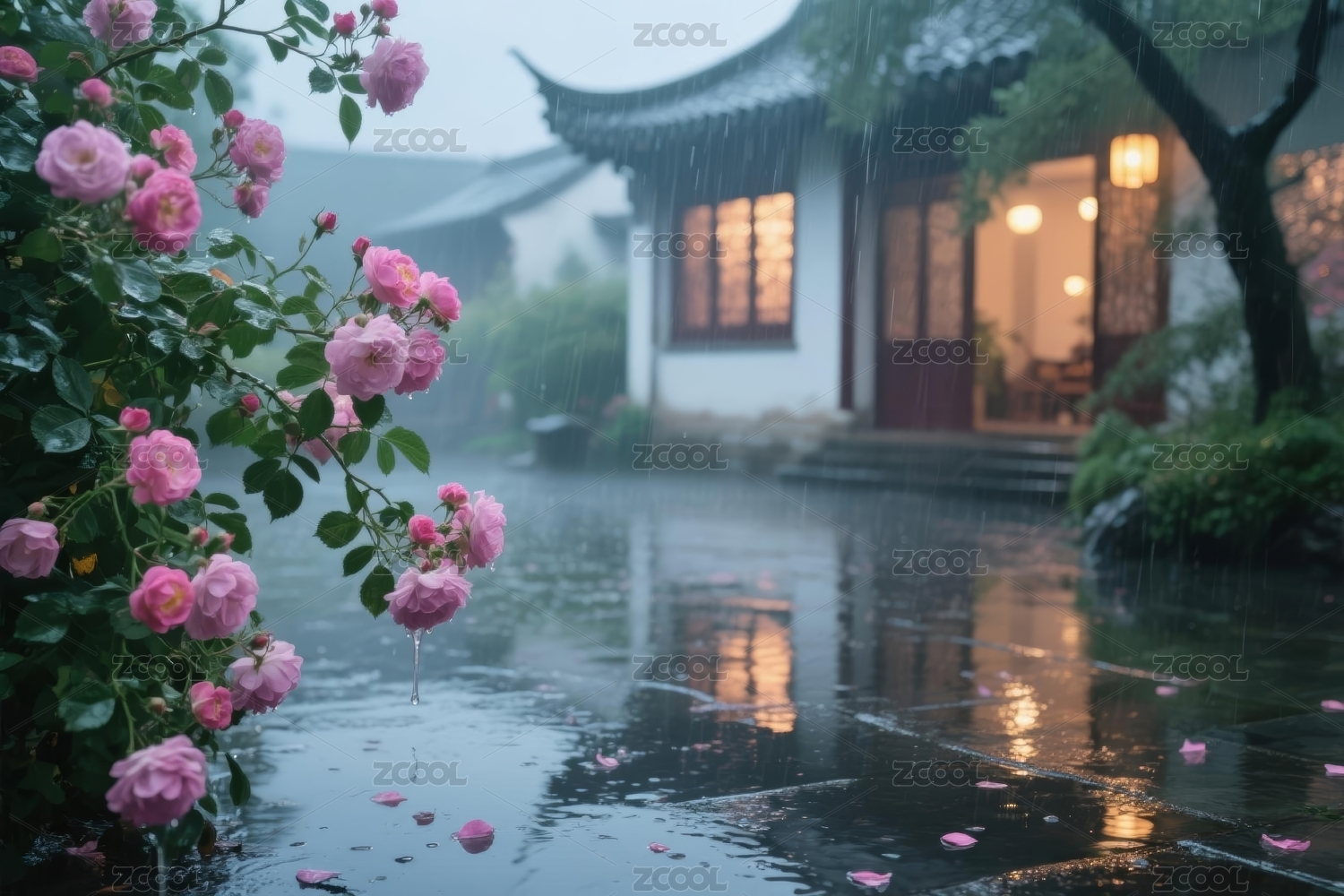 庭院,门廊,灯光,传统,自然,宁静,幽静,雨景,花朵,粉色