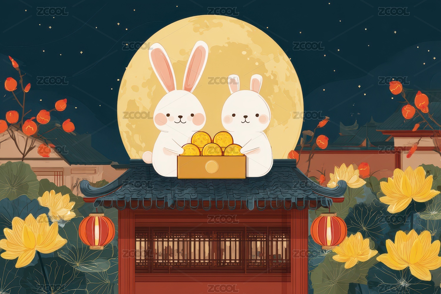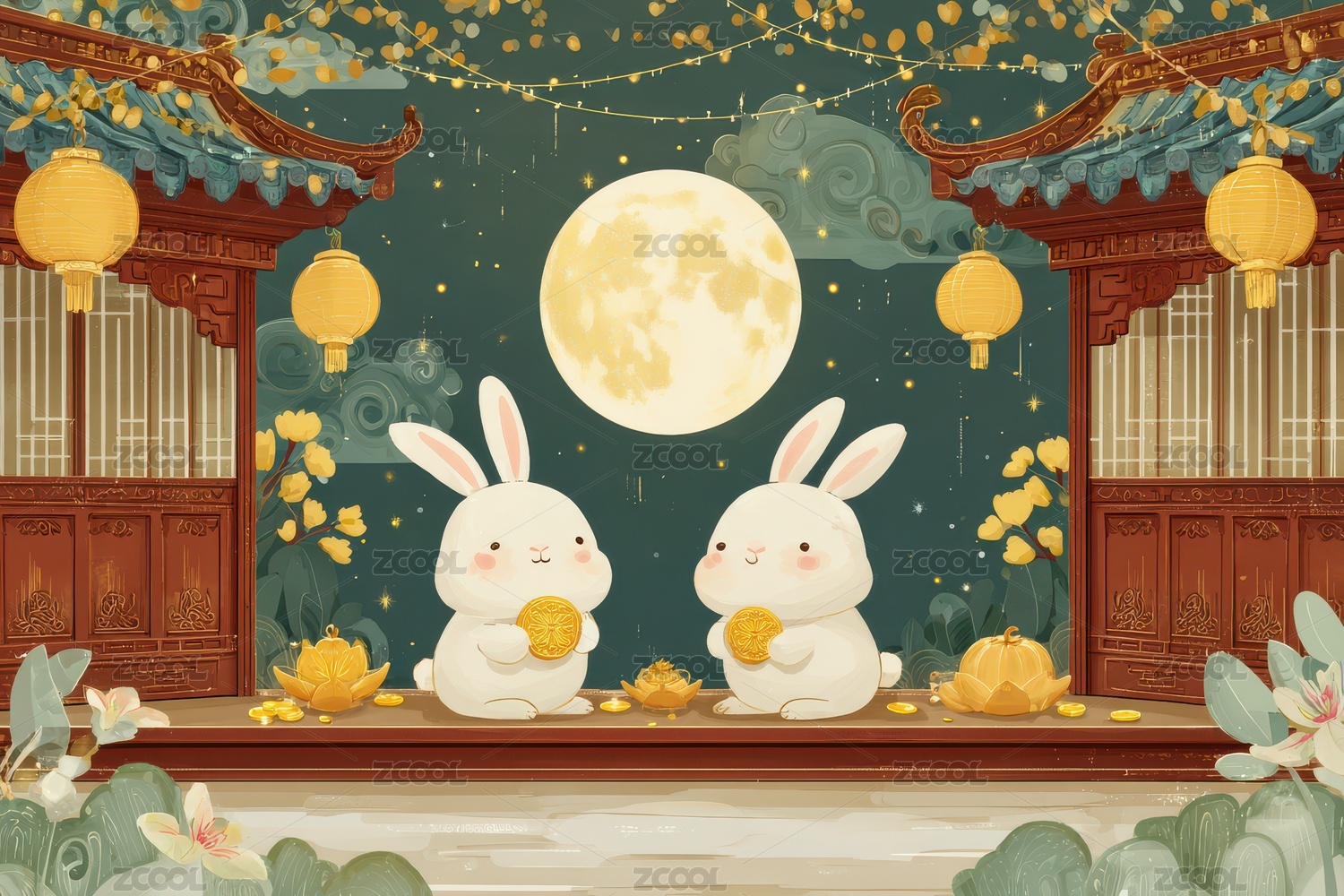 建筑,夜景,花朵,灯笼,兔子,金币,月亮,传统,中秋节