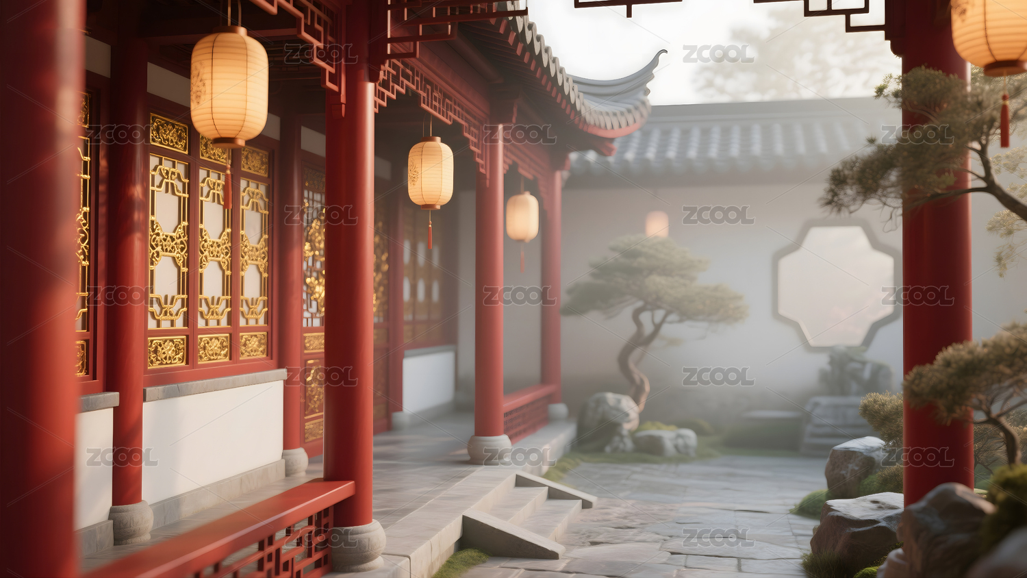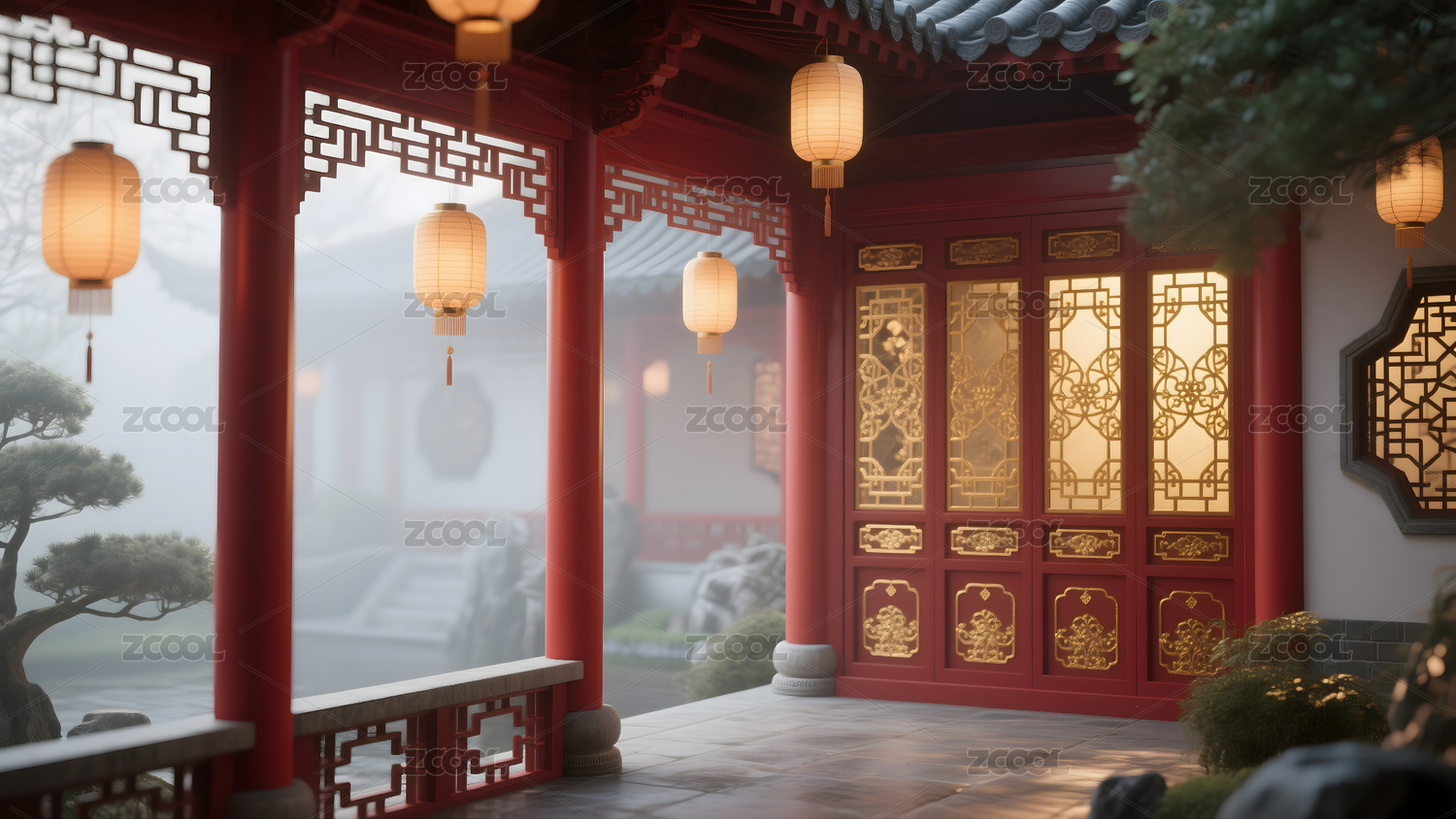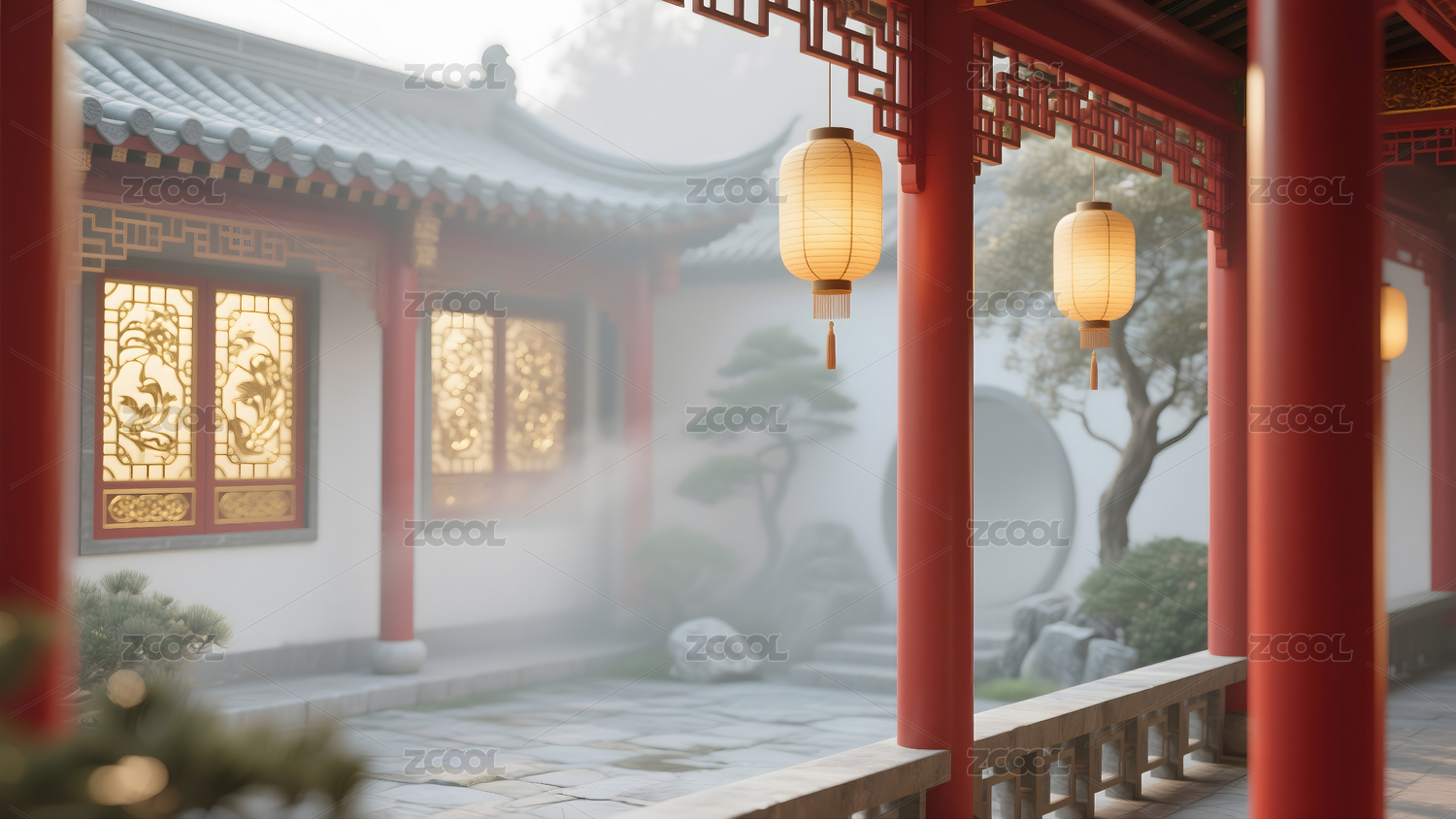 古风,禅意,建筑,灯笼,中式庭院,东方意境,朦胧美,传统,雾气,东方
