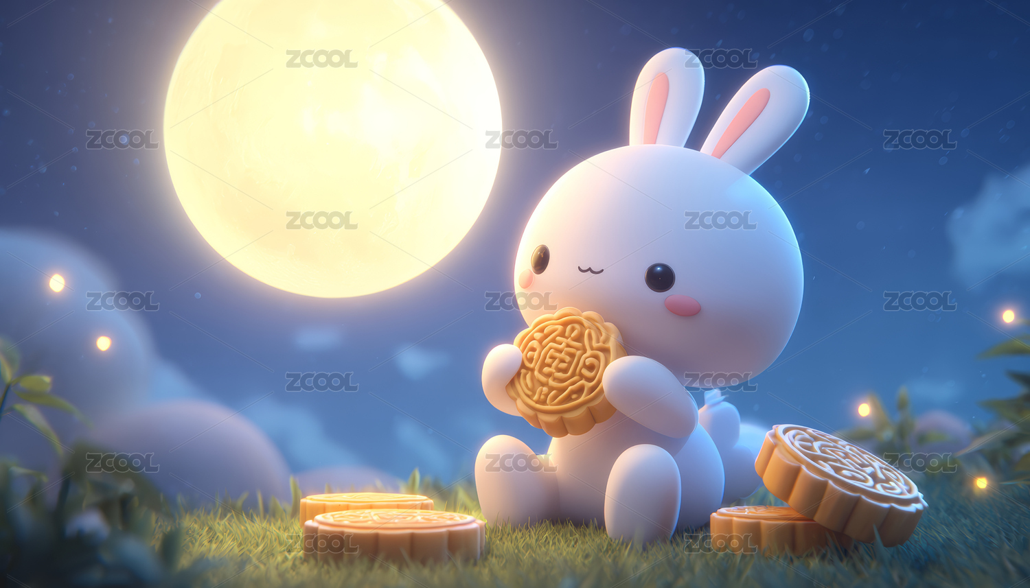 可爱兔子抱着月饼温馨场景