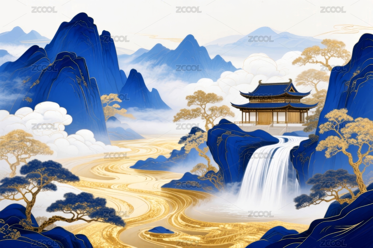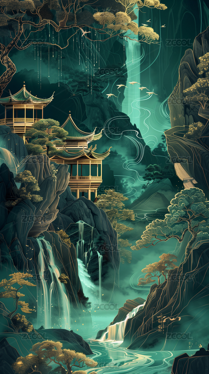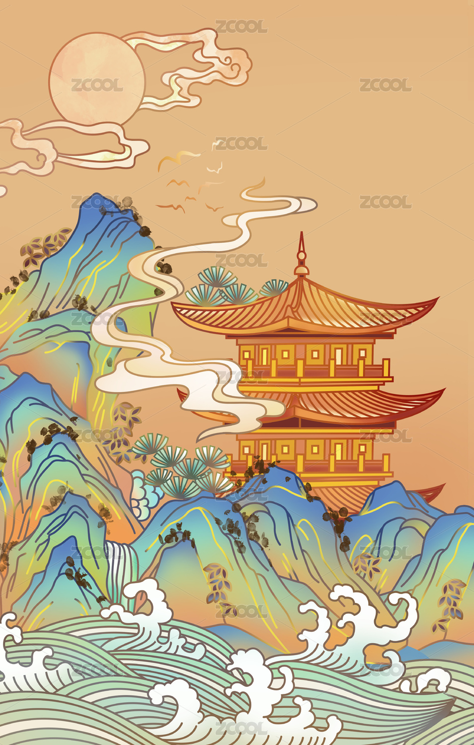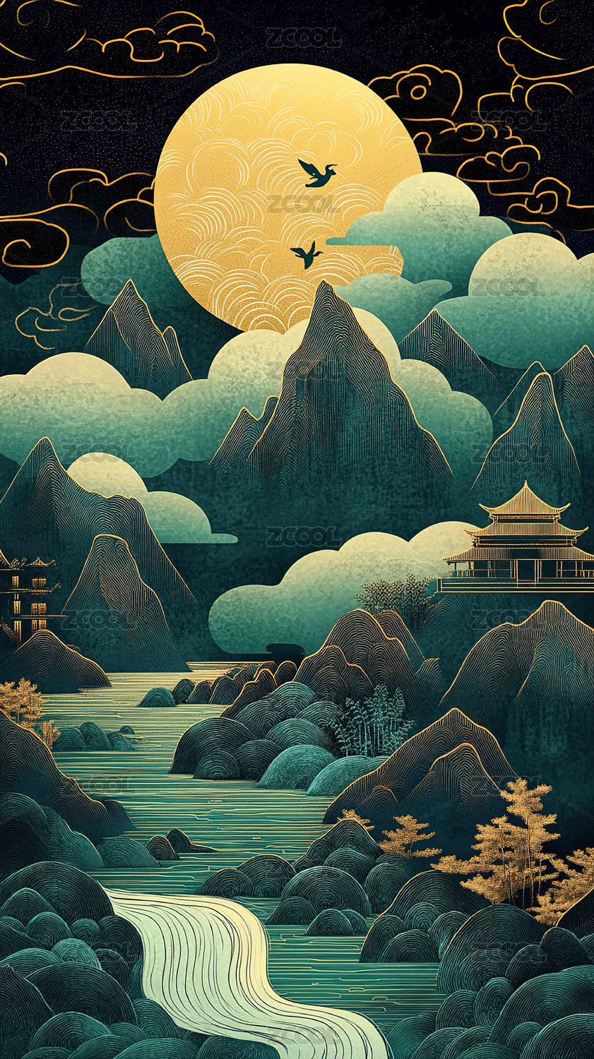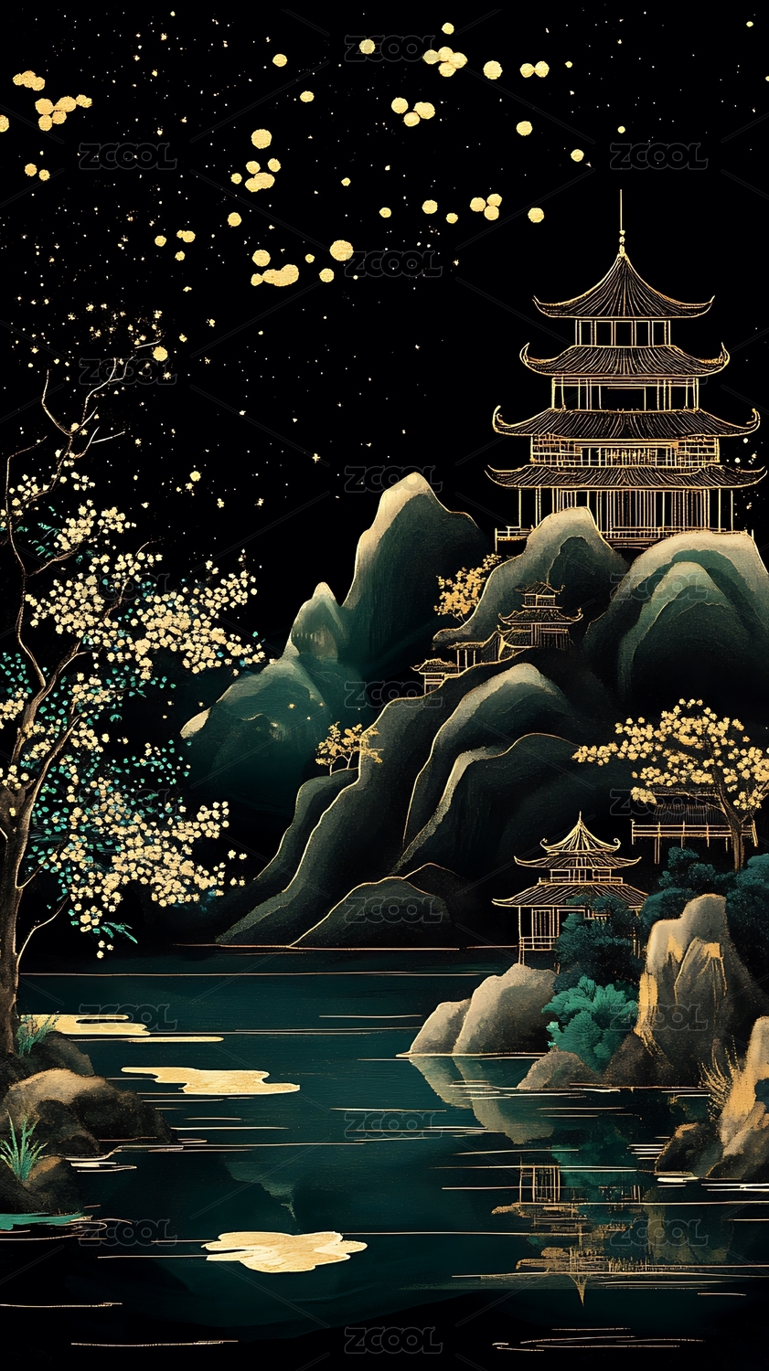 山水,月夜,楼阁,国风,意境,古建筑,水墨画,唯美,艺术,文化