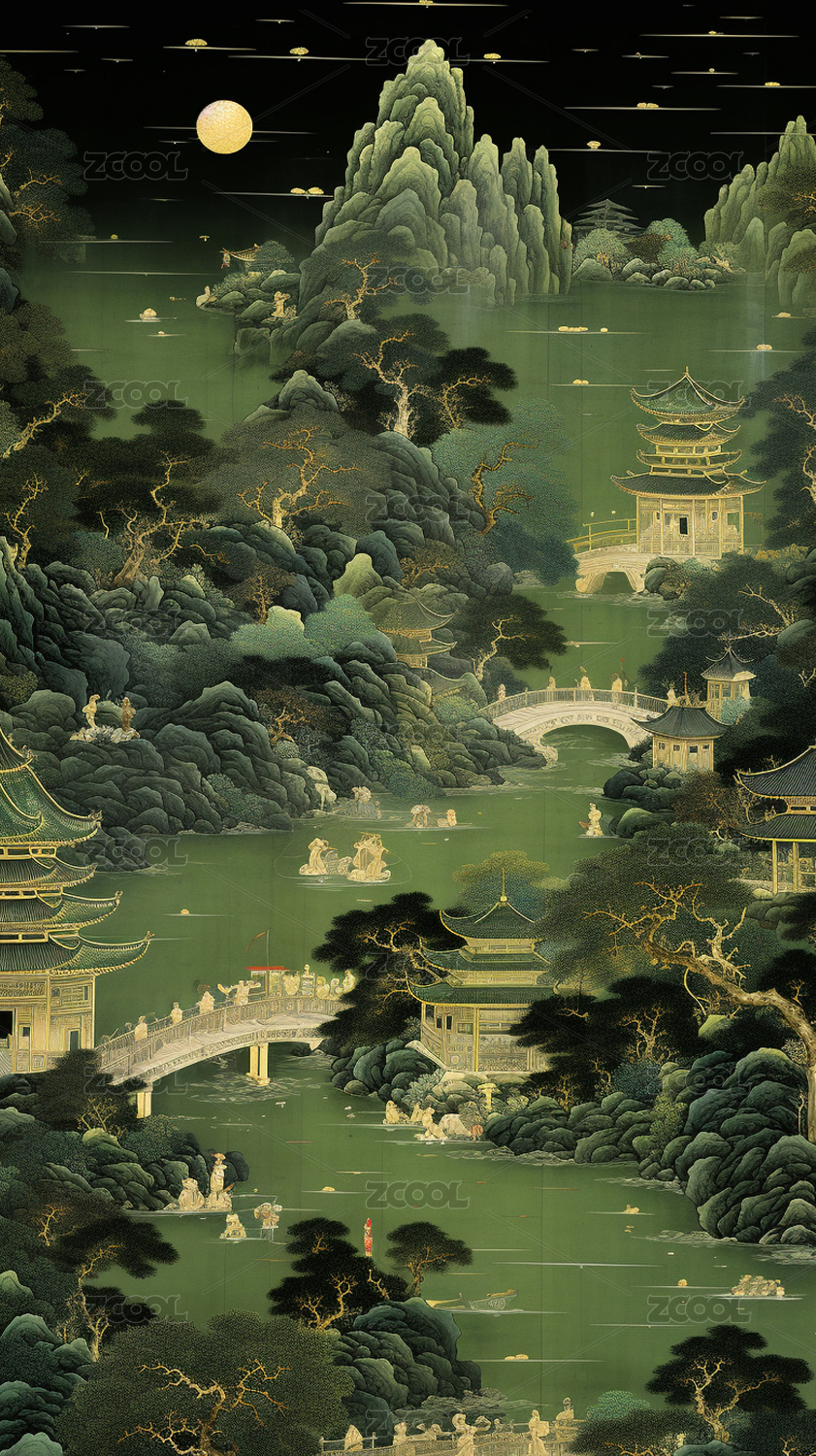 山水,月夜,楼阁,国风,意境,古建筑,水墨画,唯美,艺术,文化