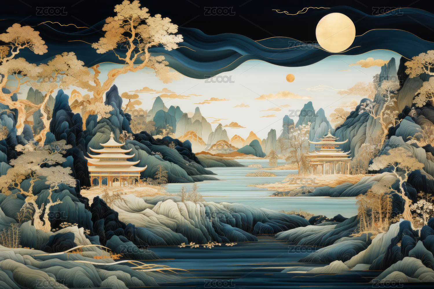 新中式鎏金山水背景