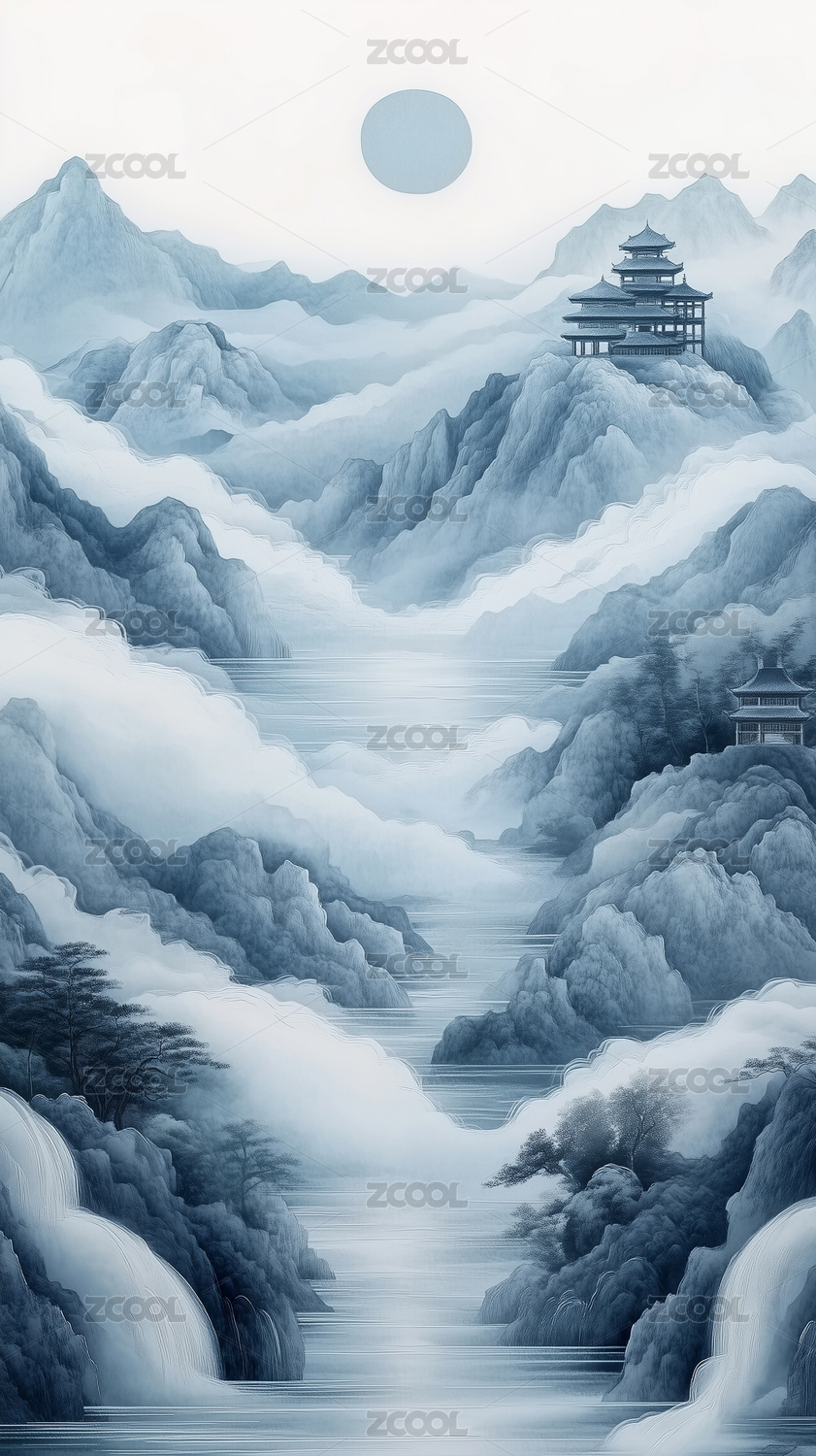 水墨风山水楼阁意境