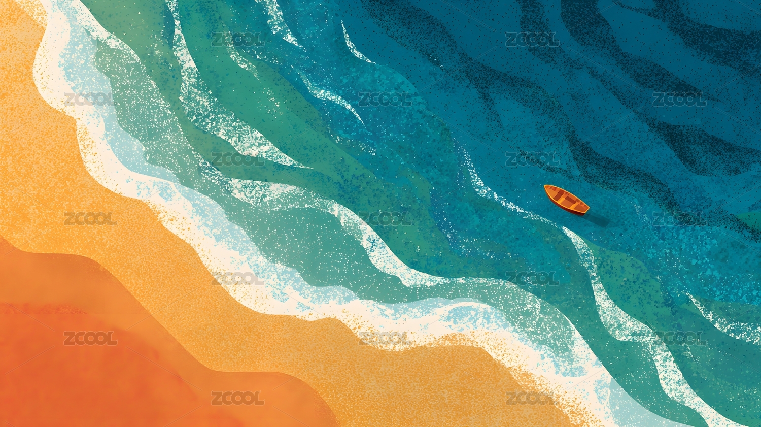 海边沙滩与海中孤舟景象