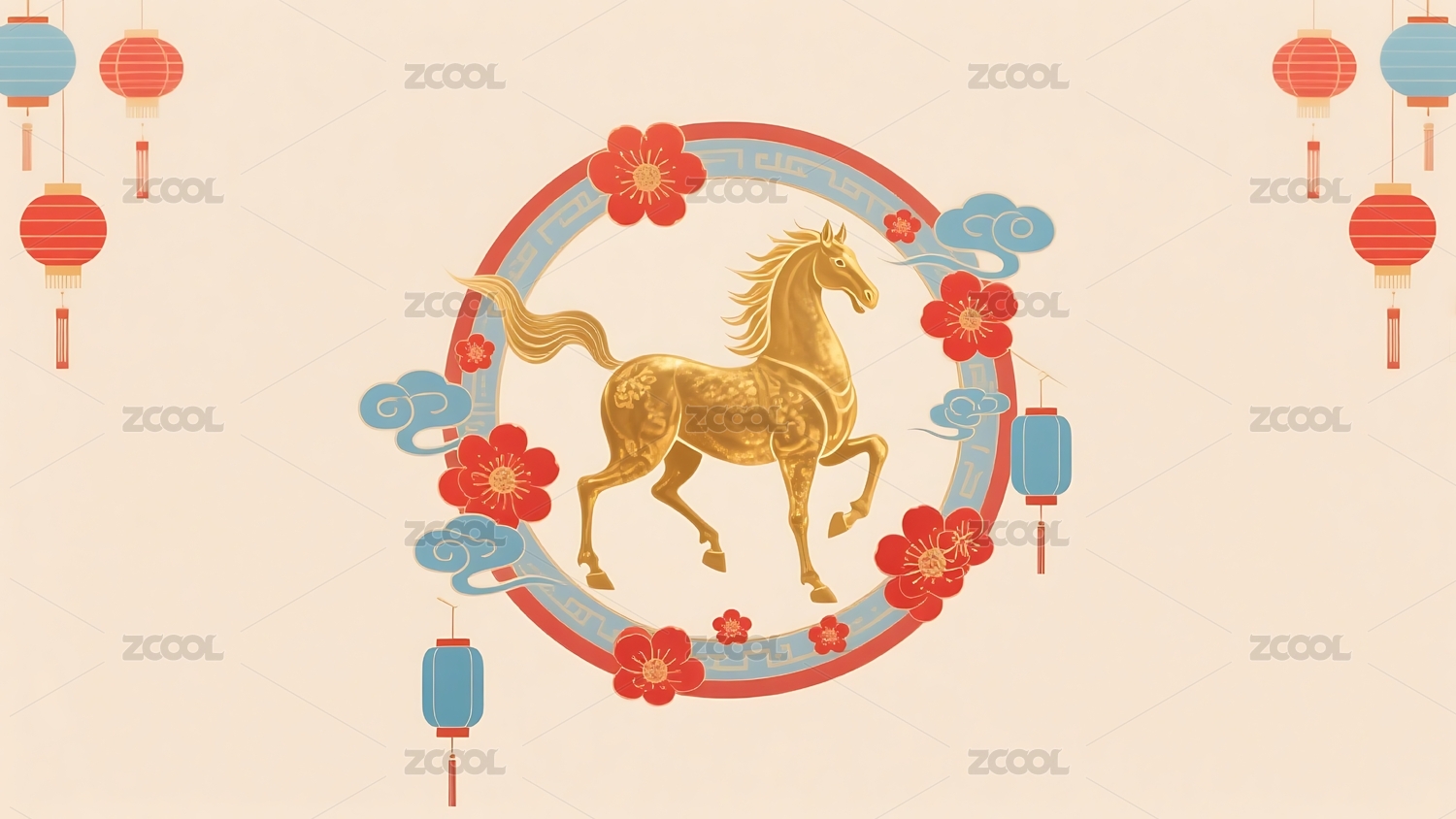 装饰,图案,马,灯笼,金色,圆形,花朵,云朵,梅花,红色