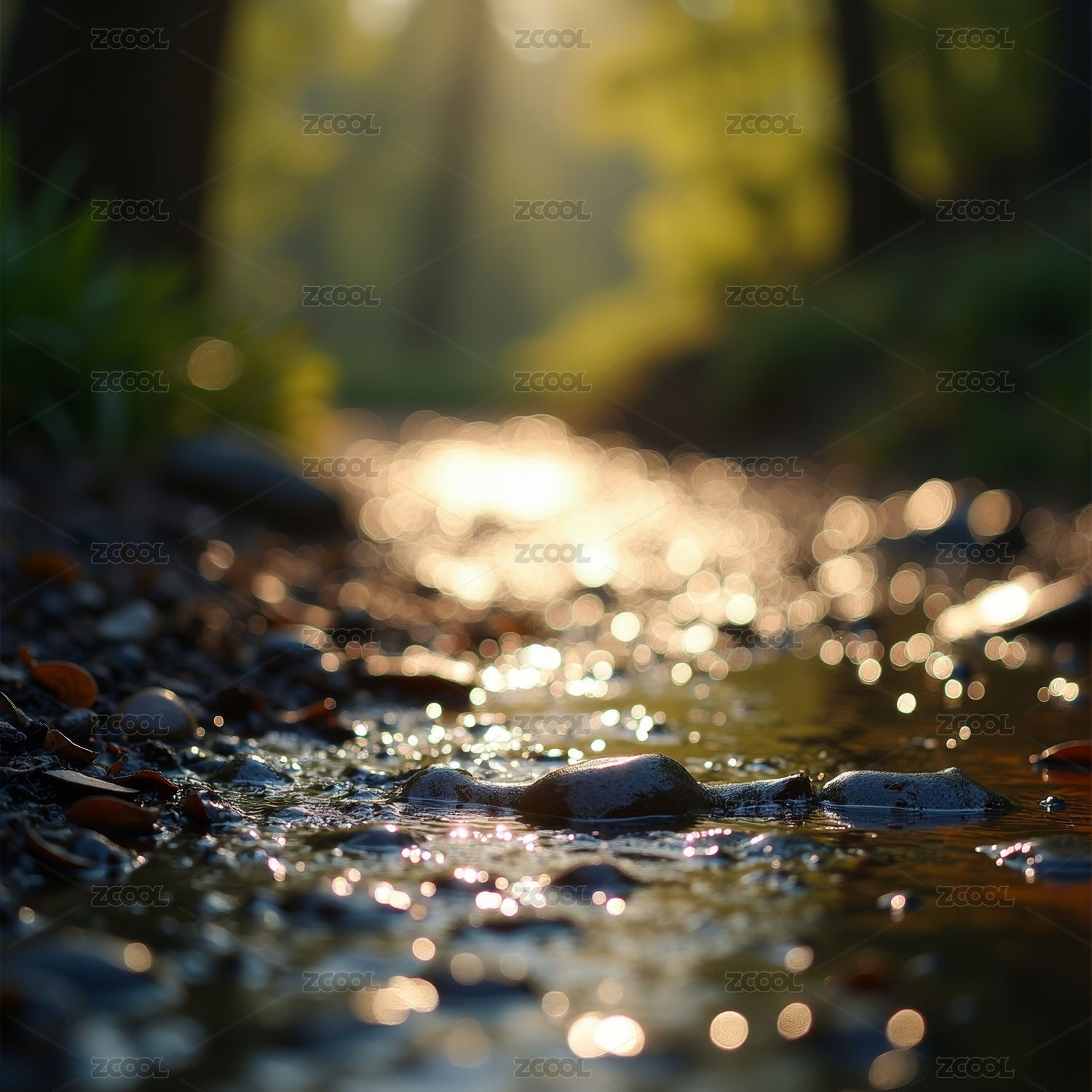 阳光洒在森林小溪上的银色光芒