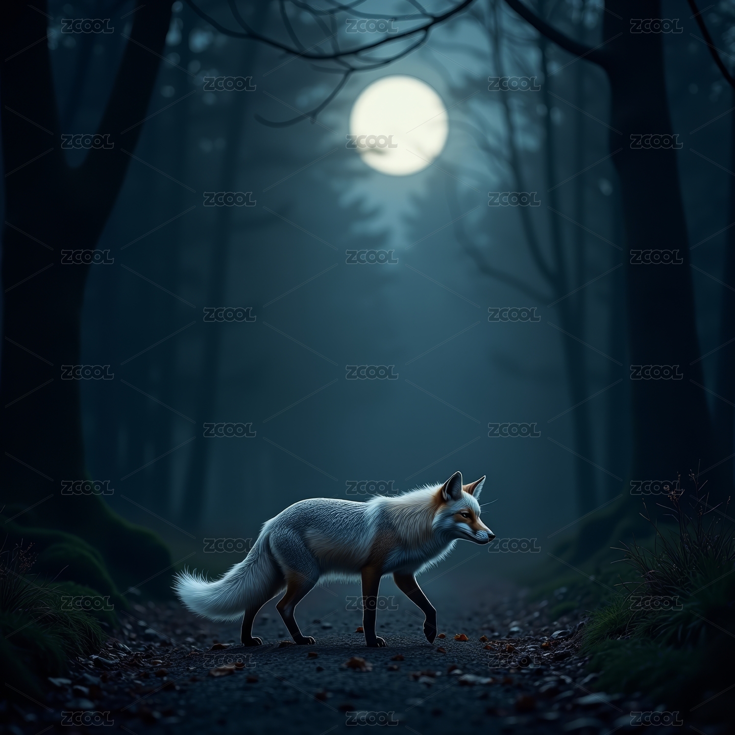 月夜森林中的白色狐狸