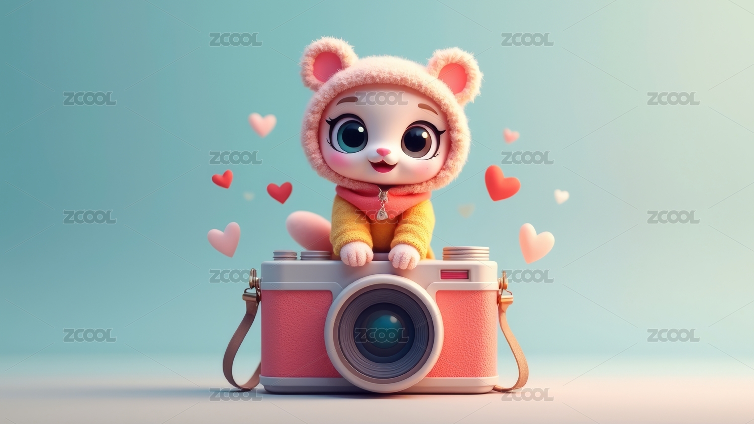 卡通,3D,可爱风格,清新色调,柔和光线,渲染,创意画面,萌趣,猫耳女孩,黄色相机