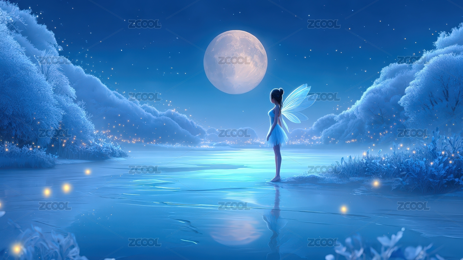 静谧夜湖读书人物风景插画艺术装饰画素材