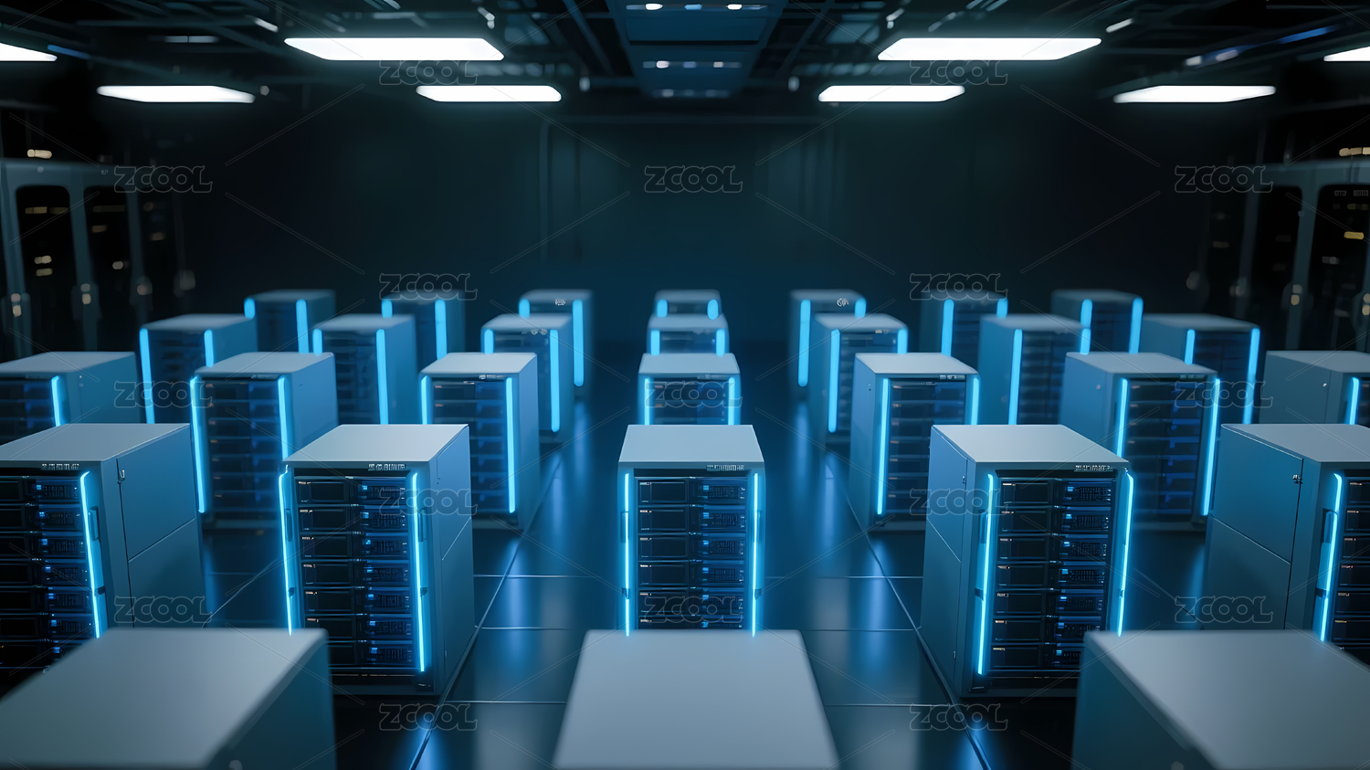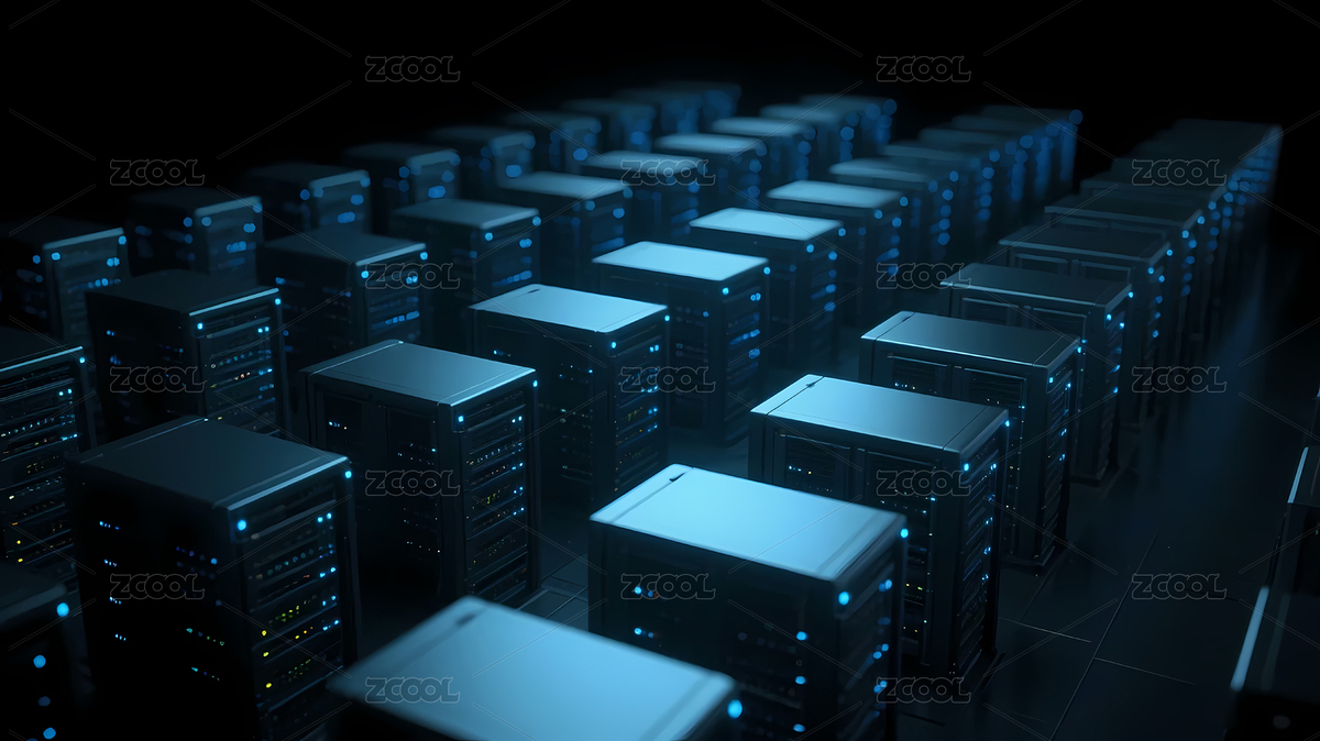 三维渲染的现代化高科技的服务器机房,强大的数据库和运算存储能力。