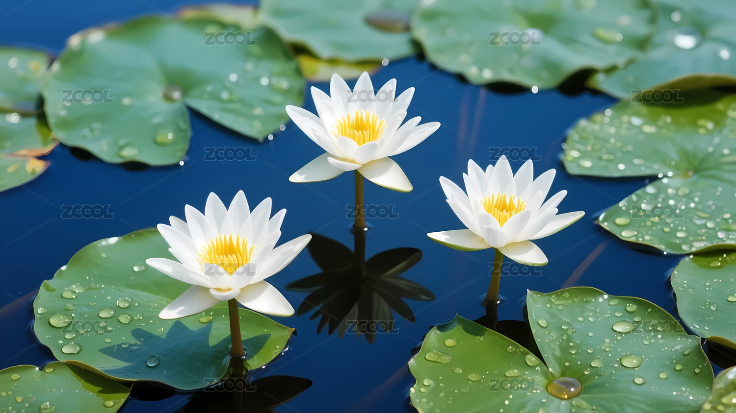 蓝色,背景,白色,平静,绿色,莲花,三朵,水面,荷叶,自然