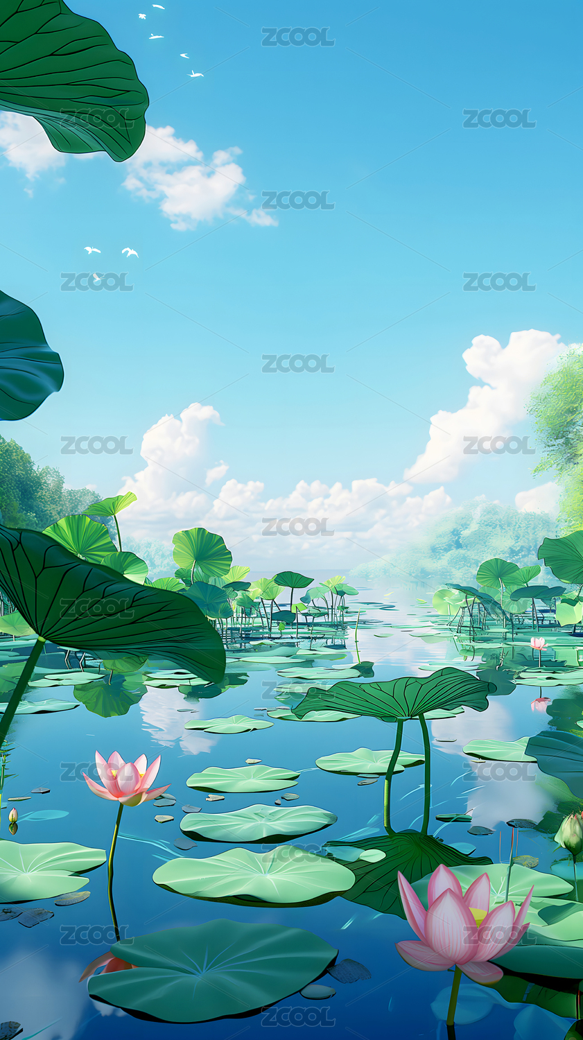 3d卡通夏天满荷叶荷花的池塘户外风景插画