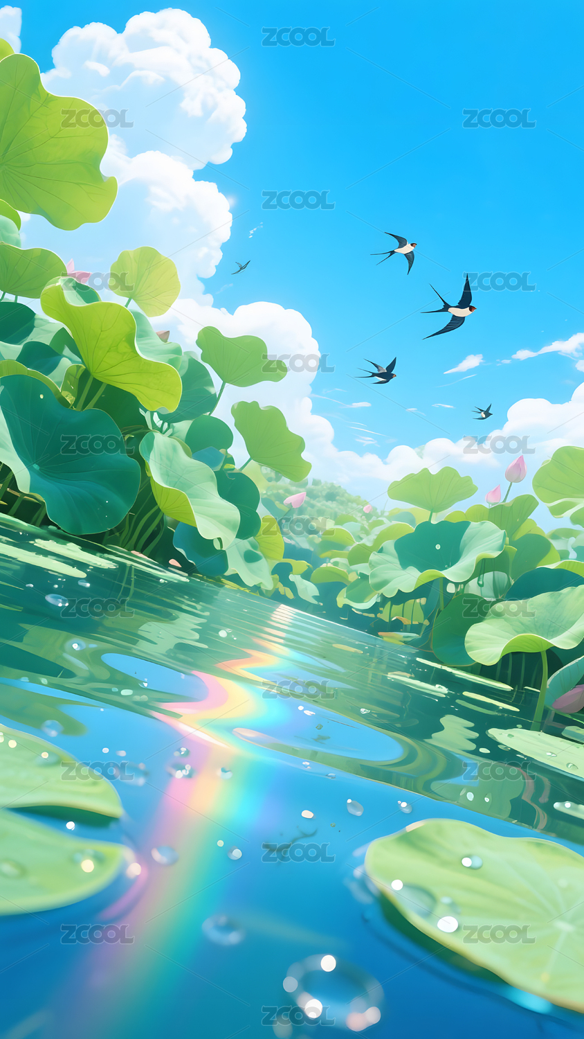荷叶,露珠,池水,蓝天,白云,光线,清新,翠绿,水面,倒影