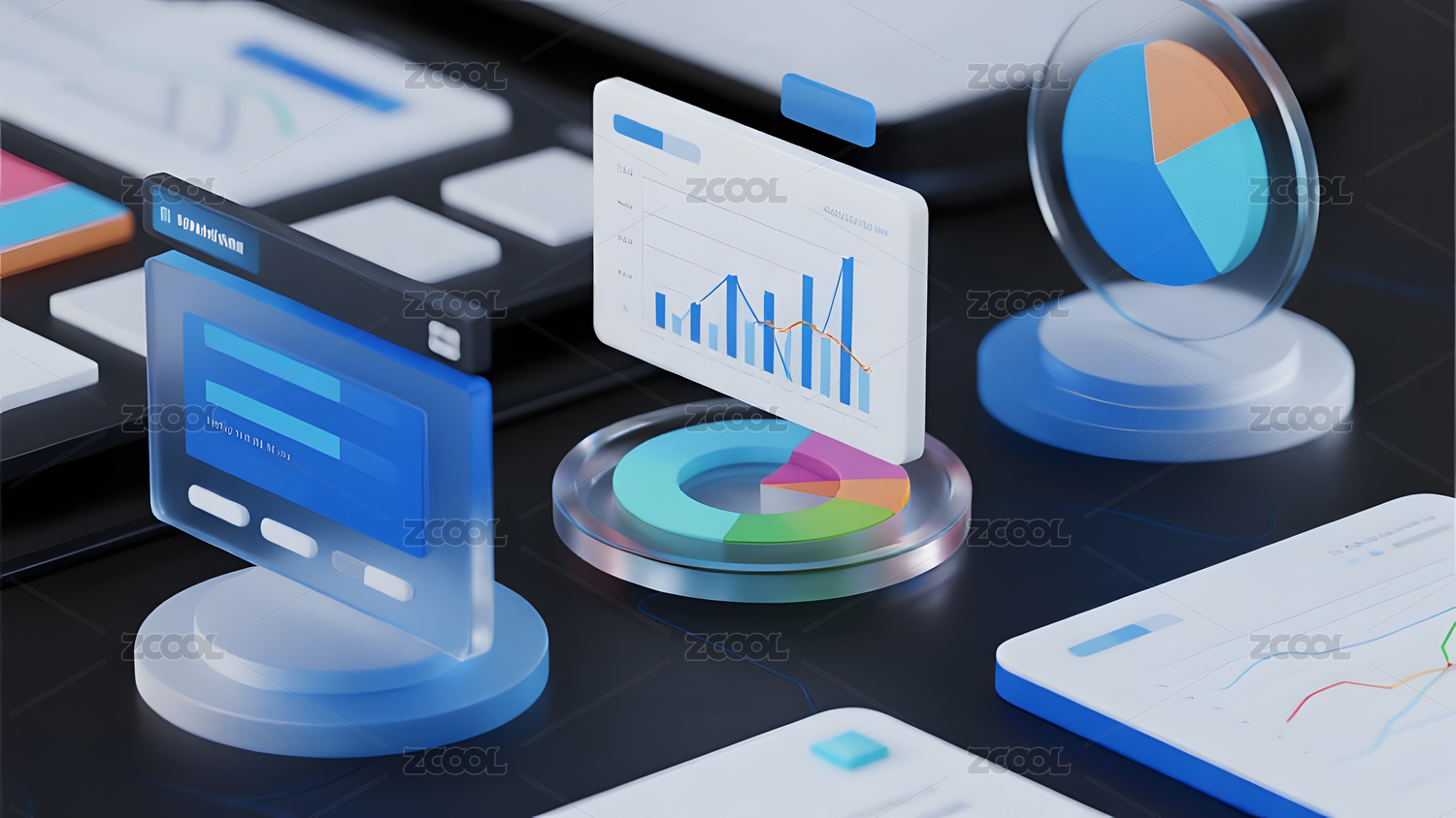 图表,数据,分析,柱状,饼图,圆环,蓝色,白色,抽象,透明