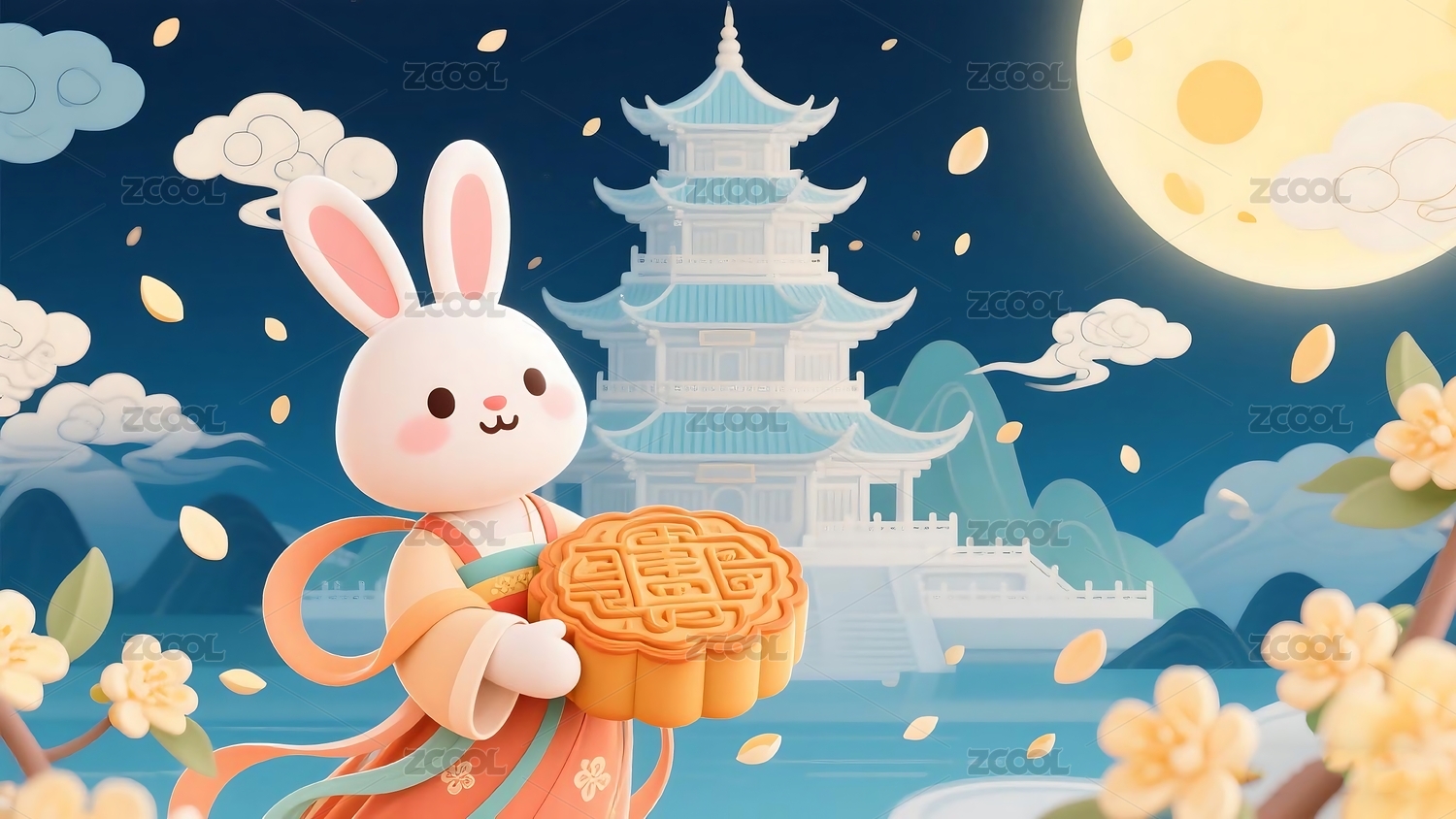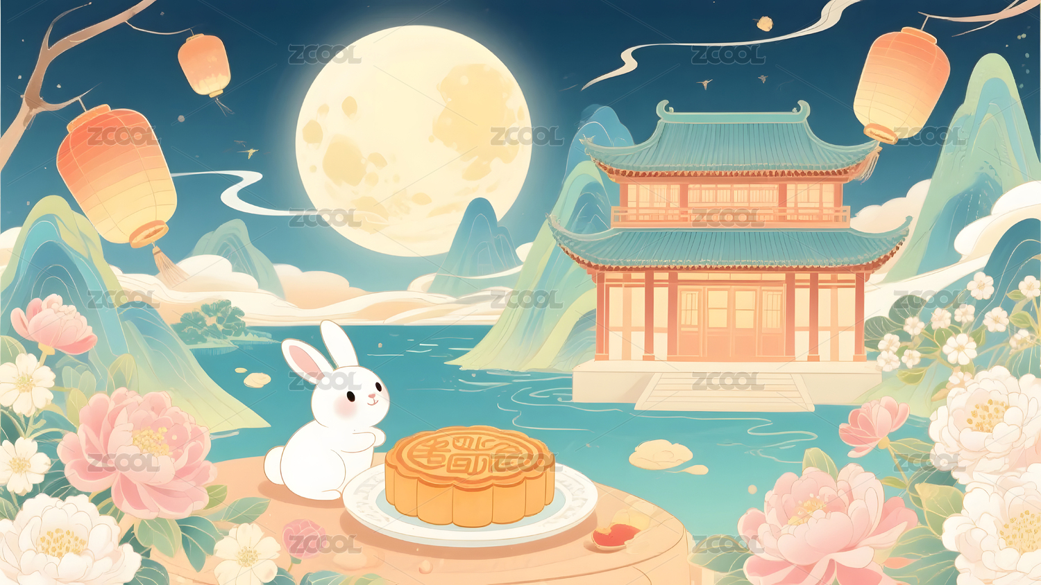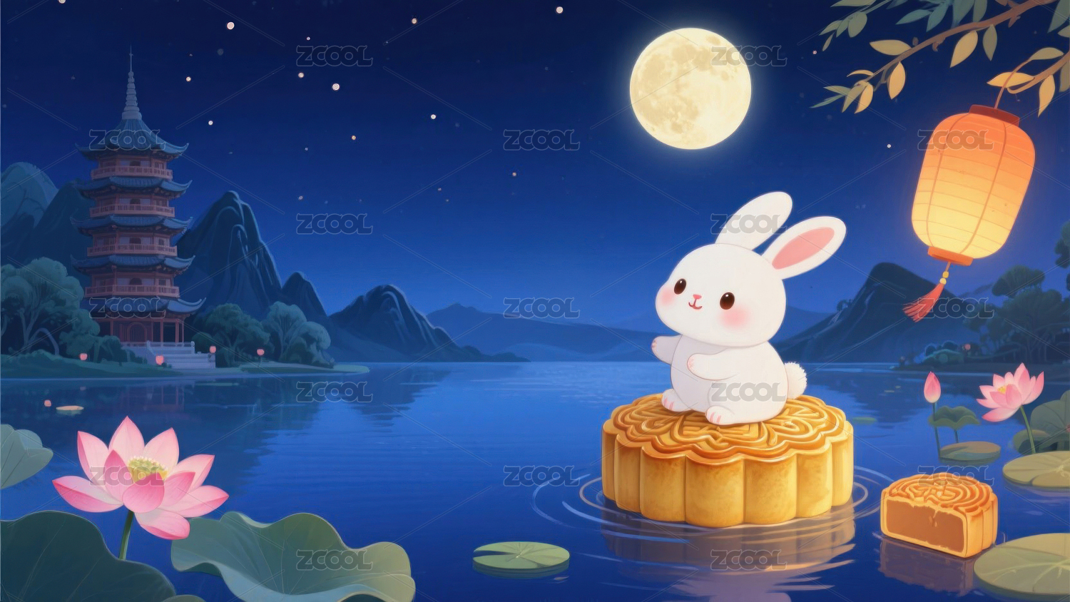玉兔,月饼,灯笼,莲花,夜晚,明月,宫殿,祥云
