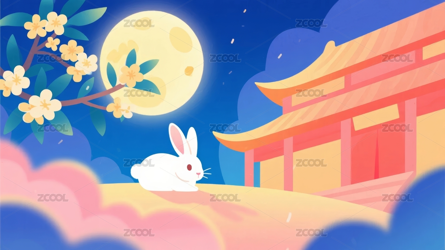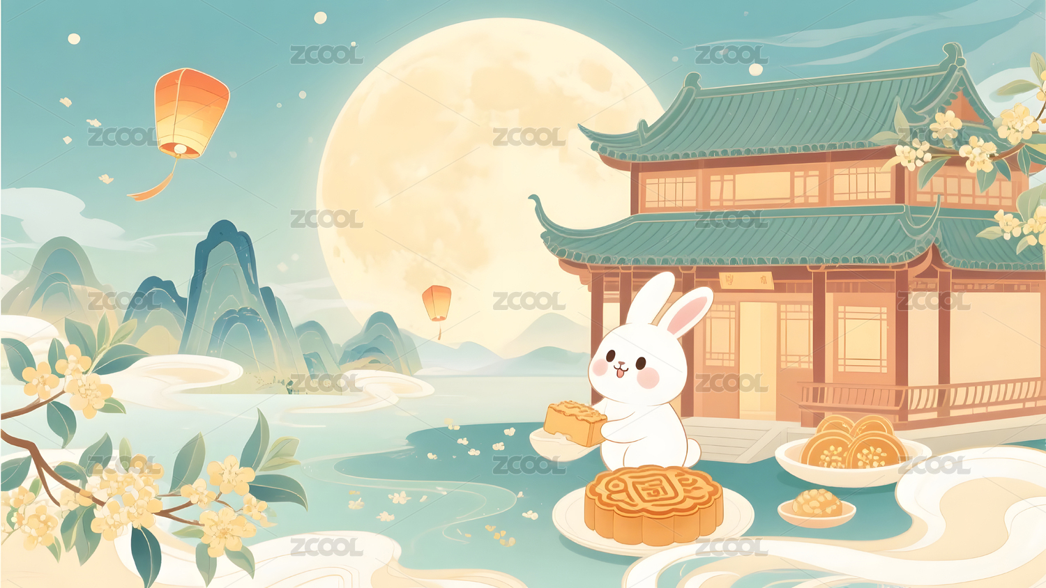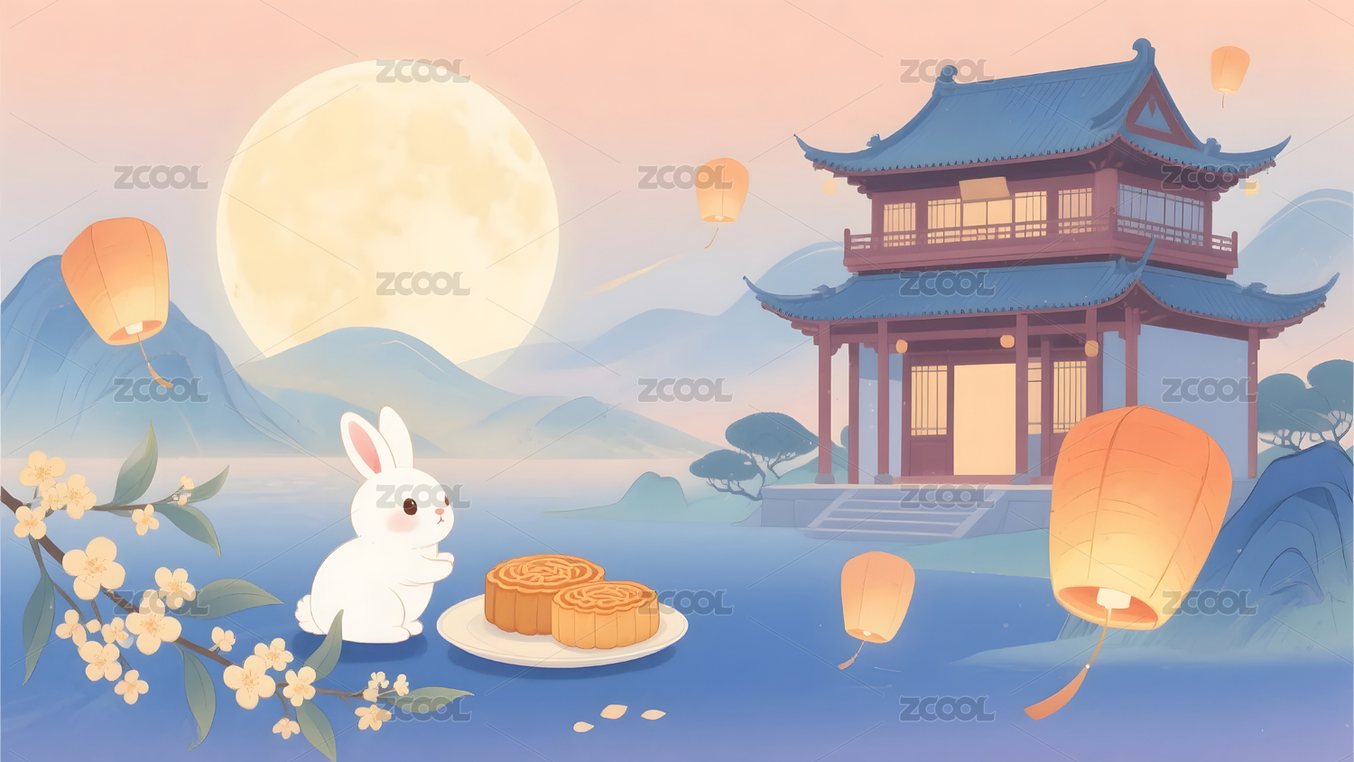 玉兔,月饼,灯笼,莲花,夜晚,明月,宫殿,祥云