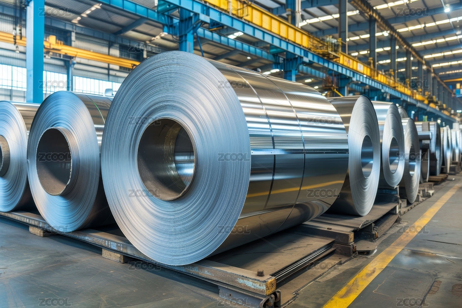 现代工厂车间生产线上排列整齐的钢卷