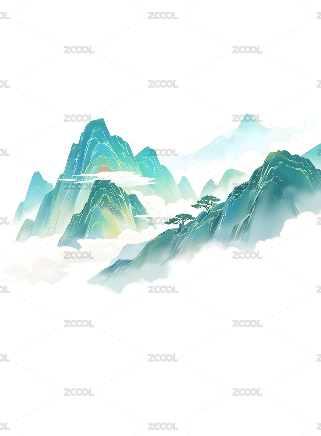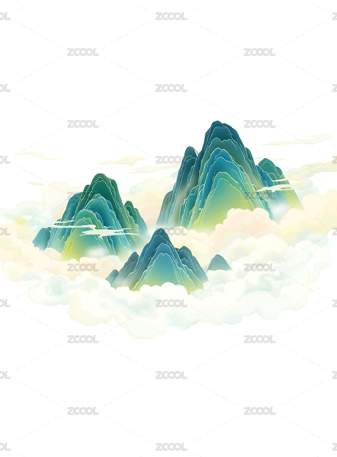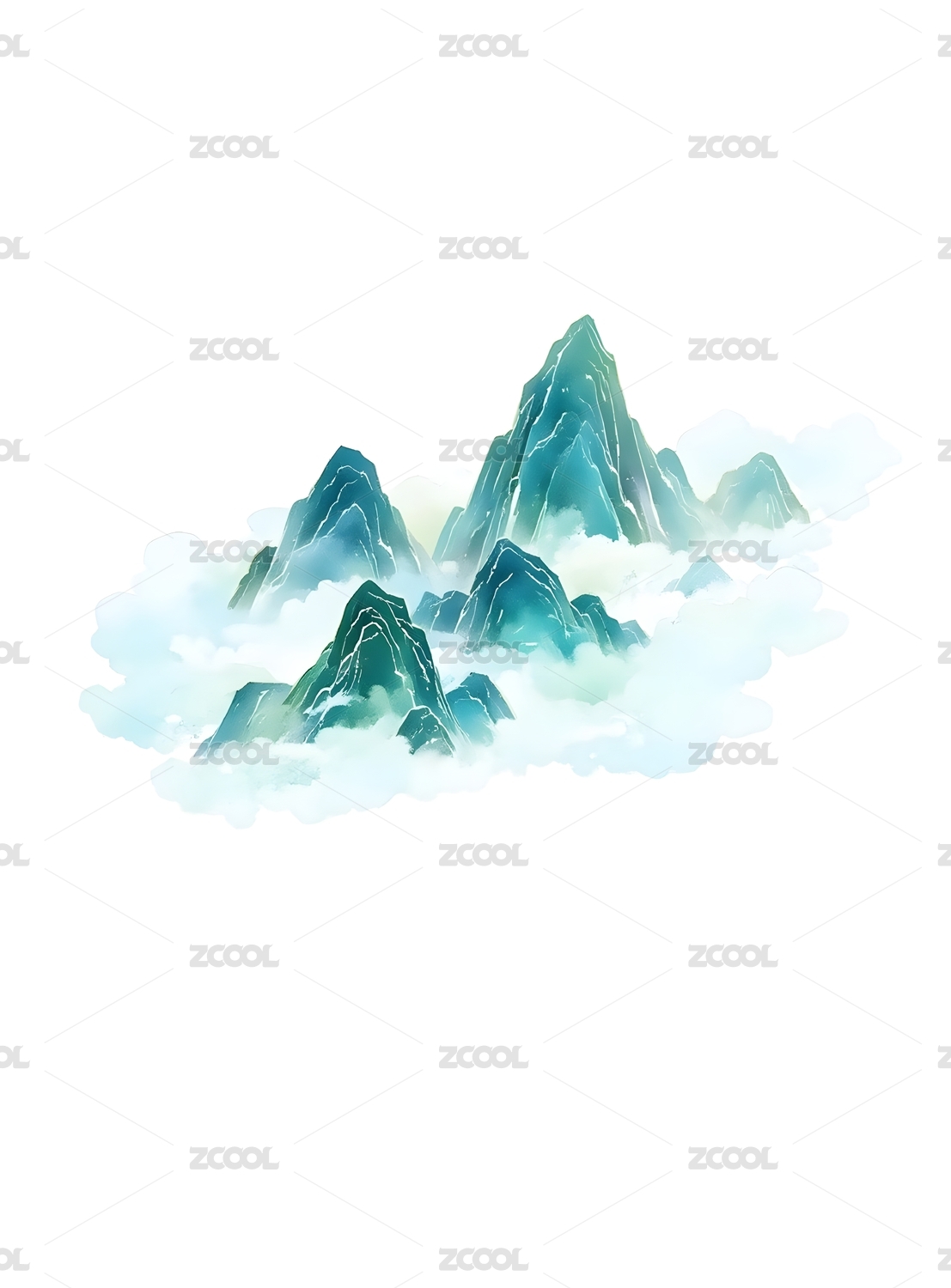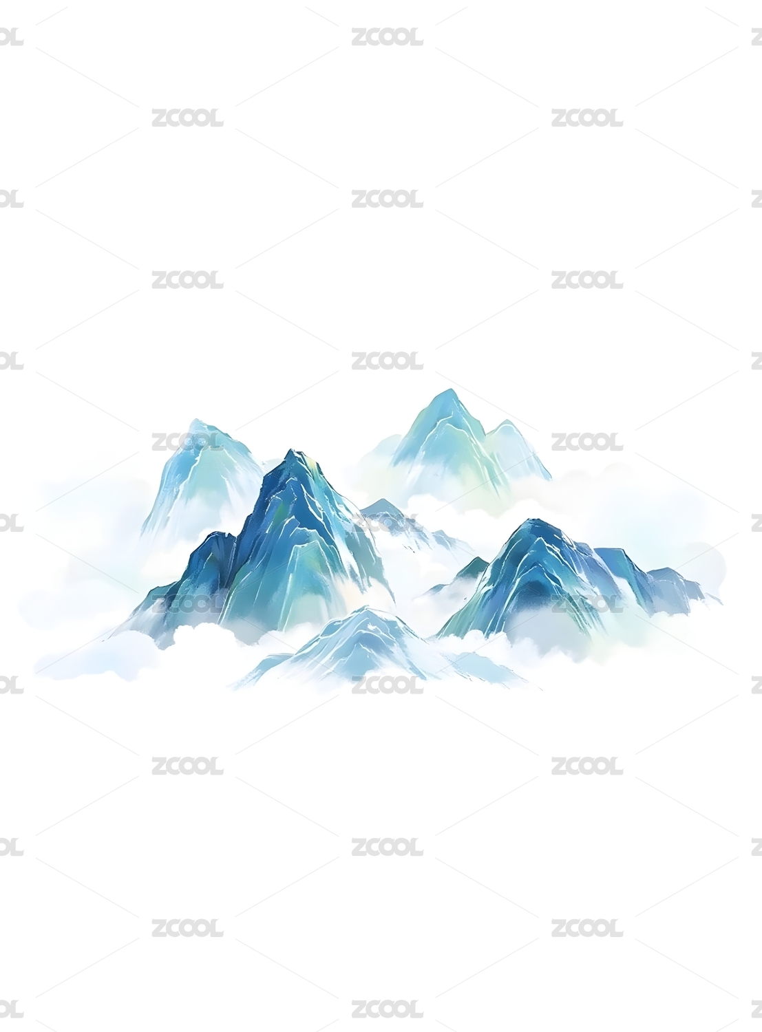 新中式,国潮,风景,山峦,山峰,云雾,青色,水墨,绘画,山脉