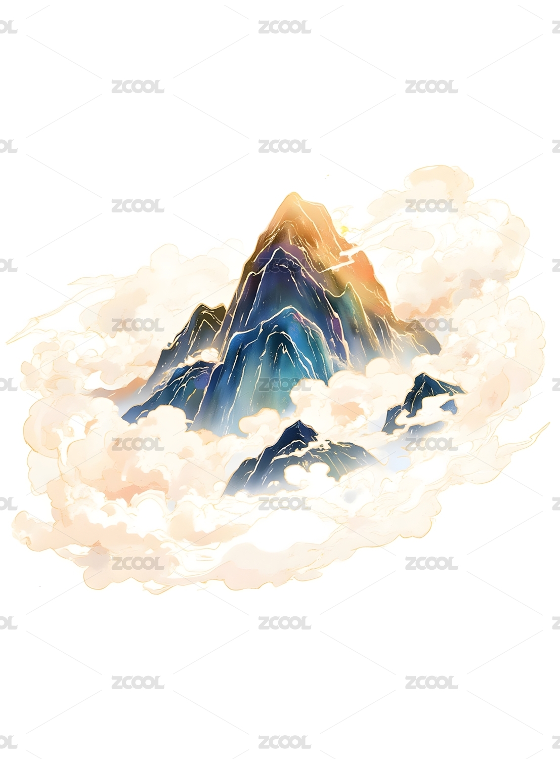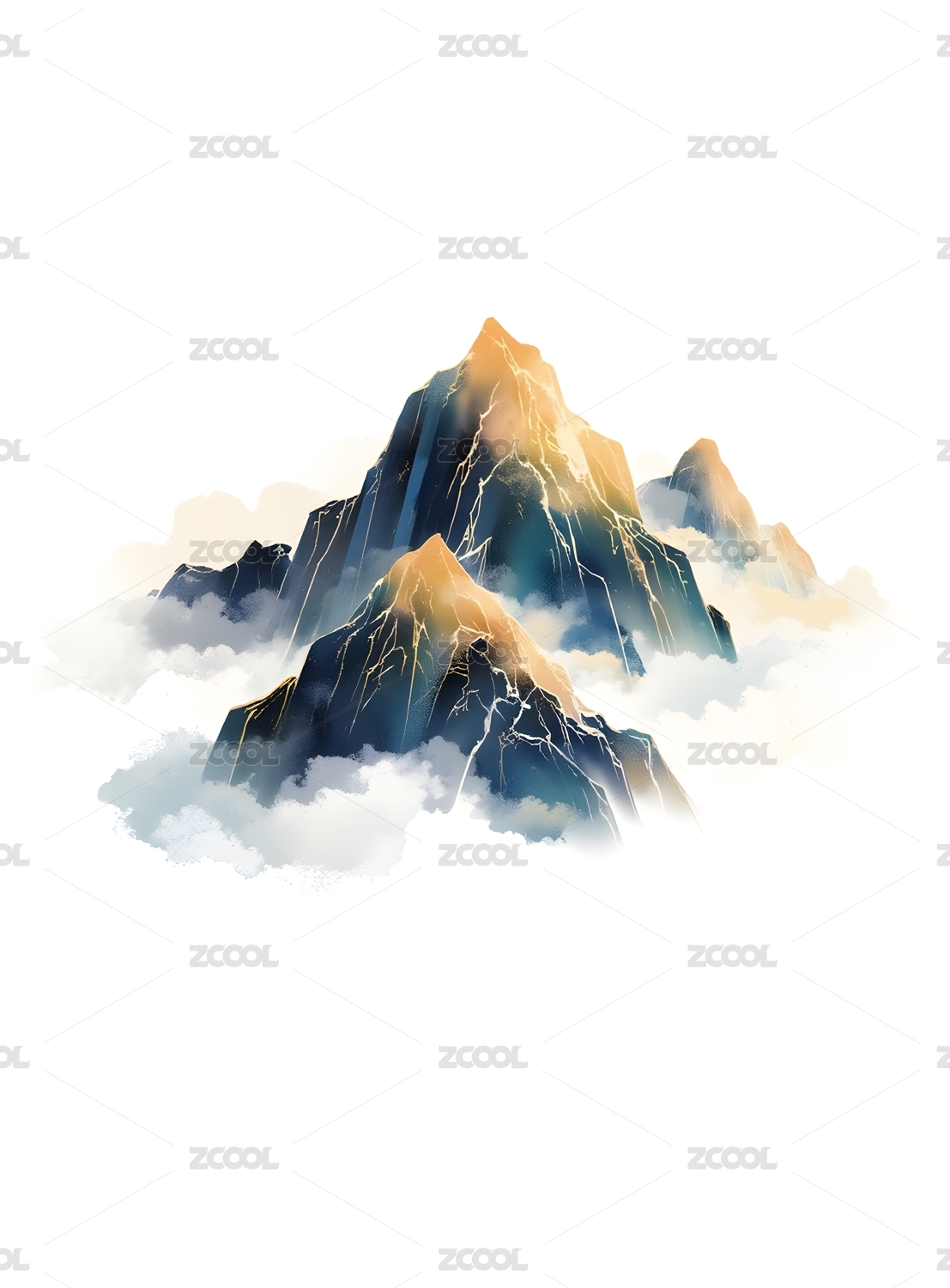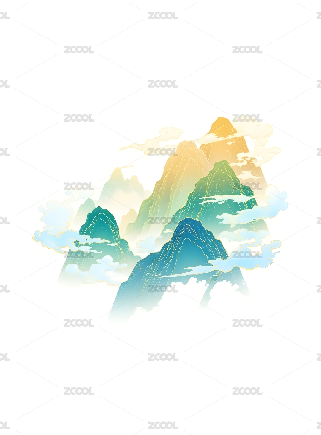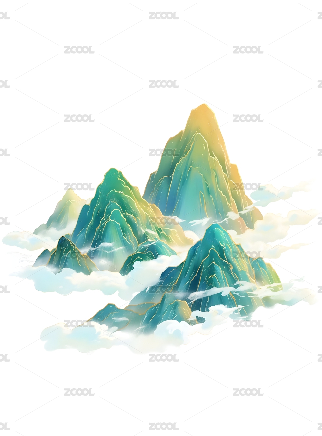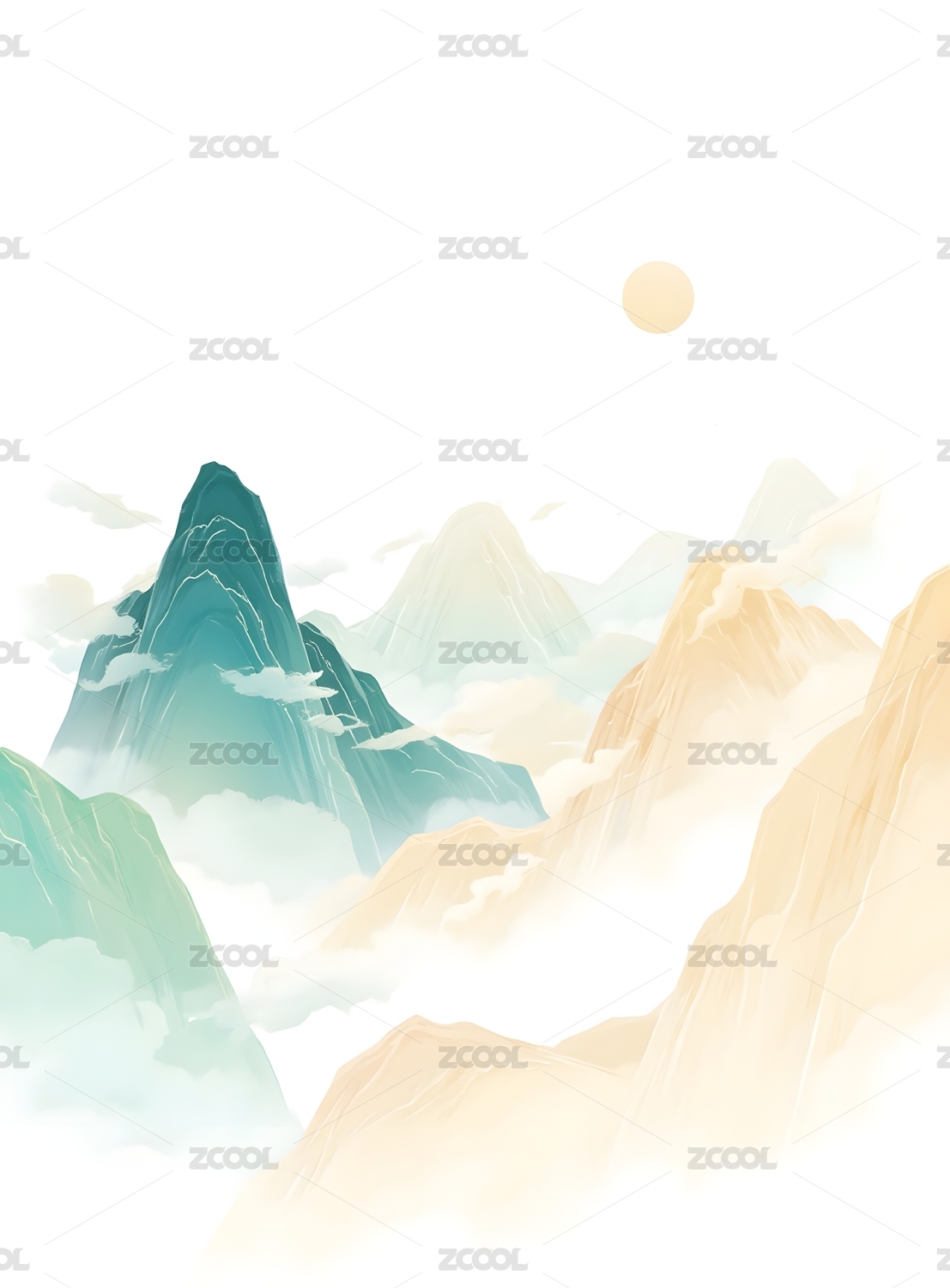 新中式,国潮,风景,山峦,山峰,云雾,青色,水墨,绘画,山脉