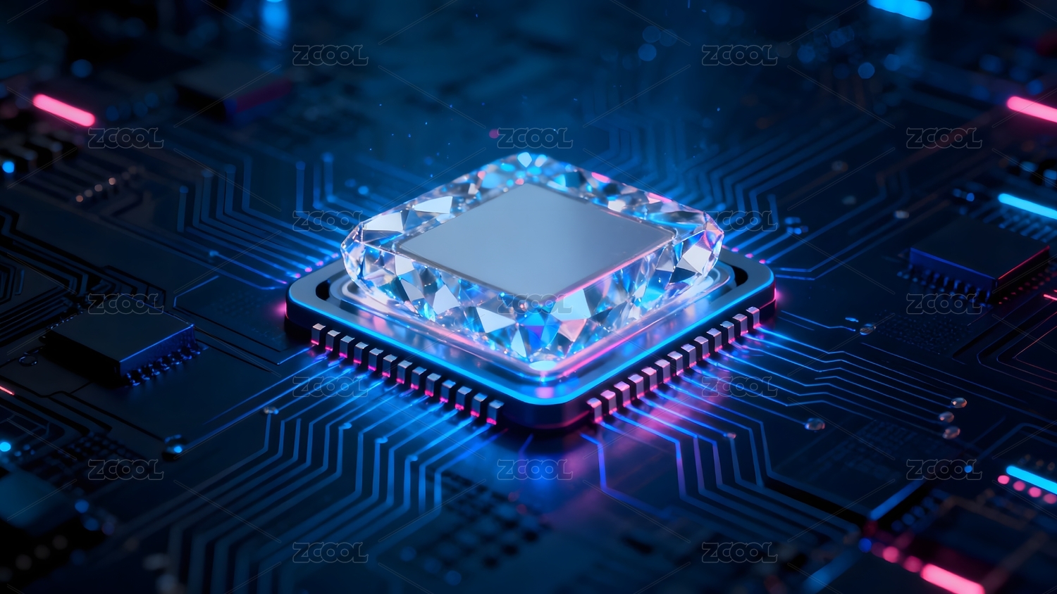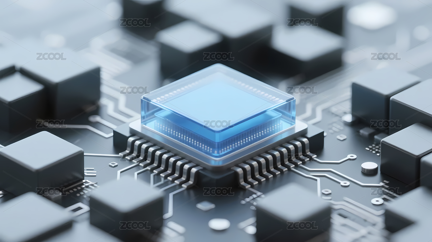 蓝色立方体芯片与电路板
