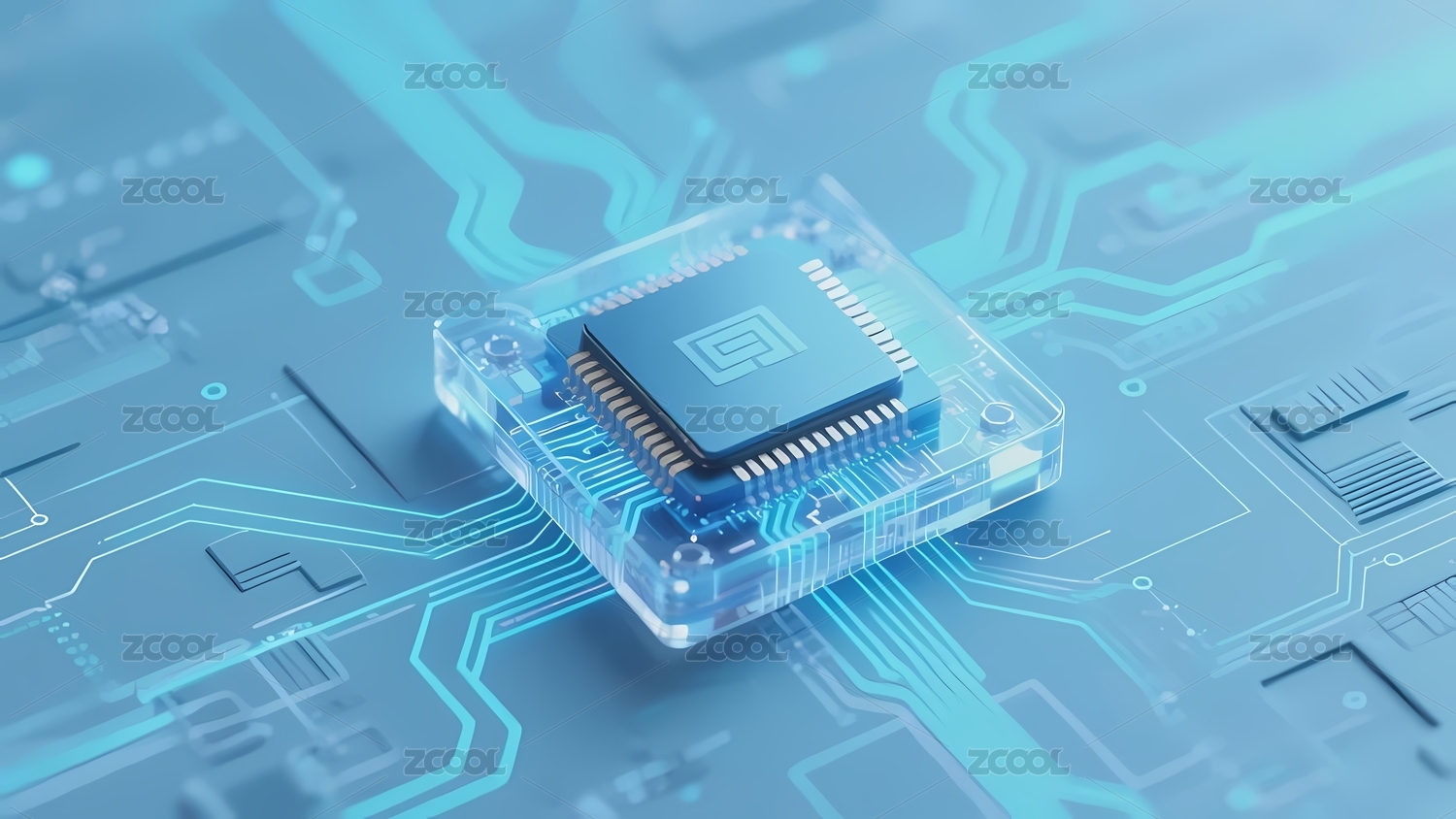 透明蓝色立方体处理器与电路板