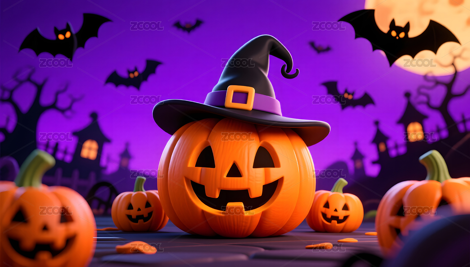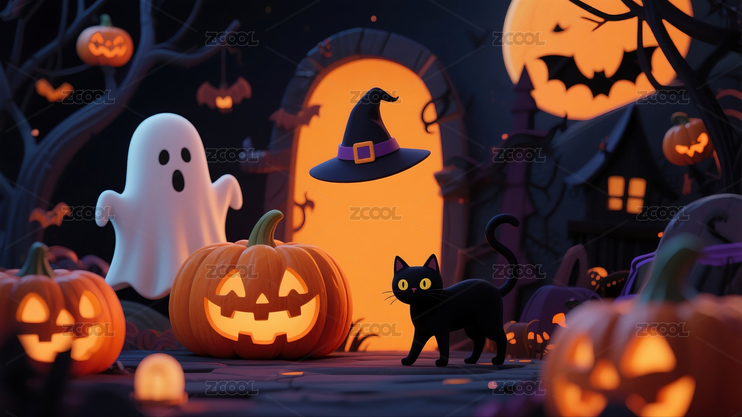 3D渲染万圣节场景南瓜怪兽三维恐怖背景