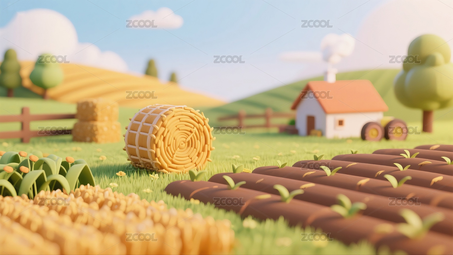 秋天农庄麦田节气风景3D渲染