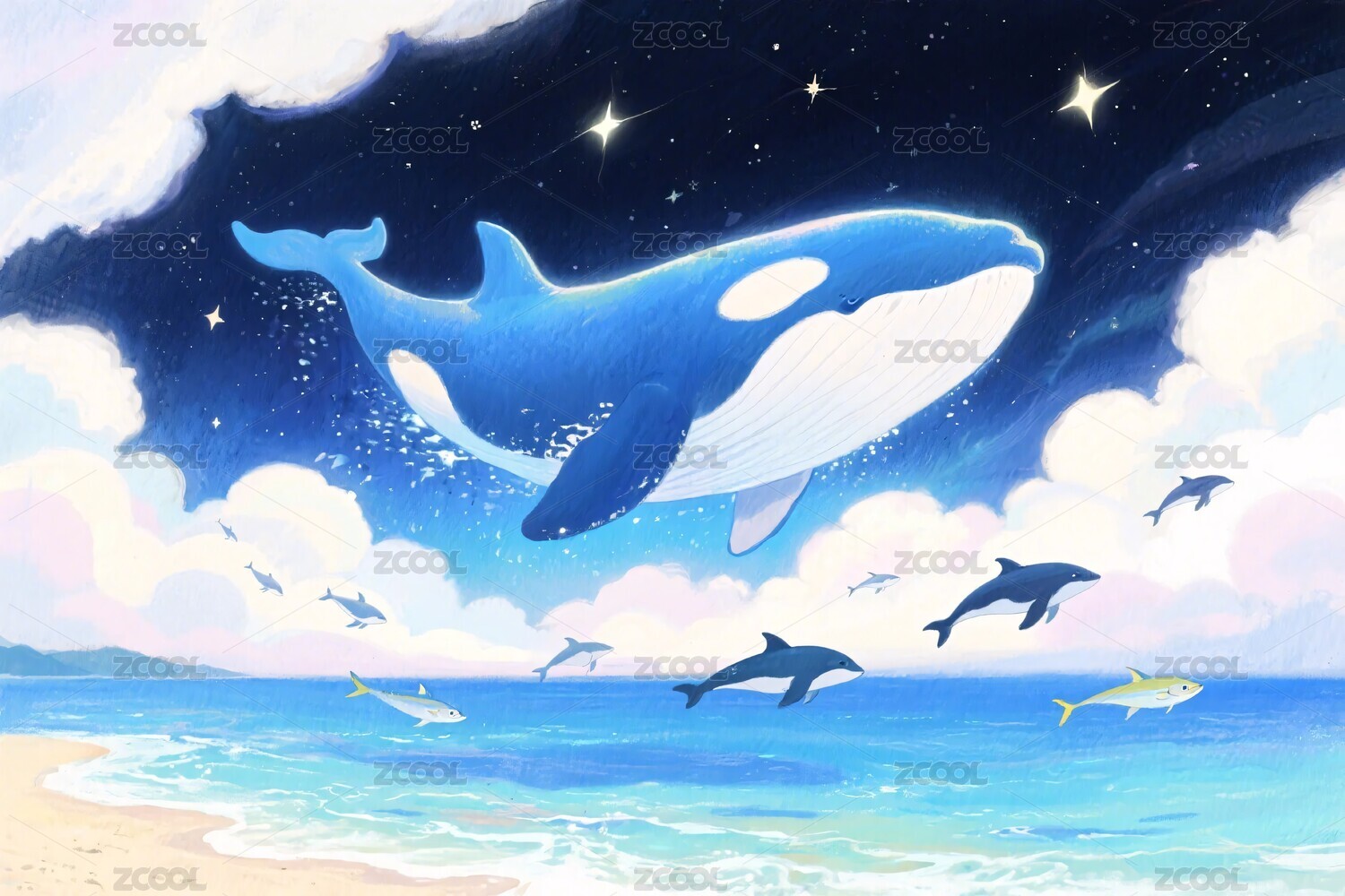 梦幻鲸鱼在天空遨游唯美插画