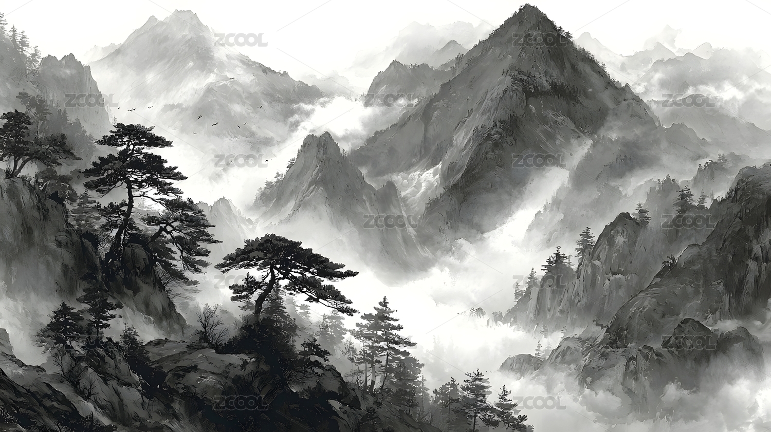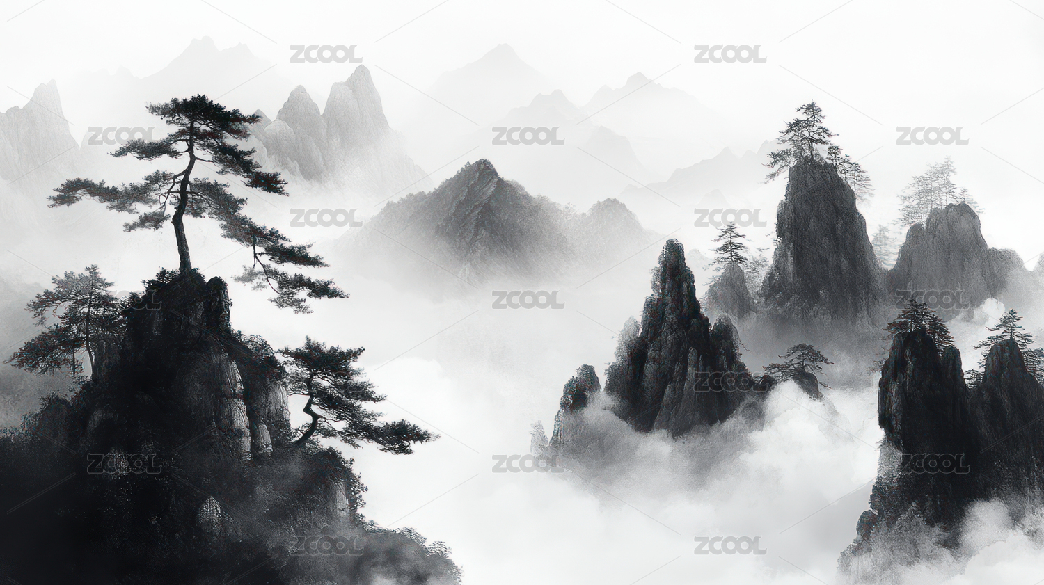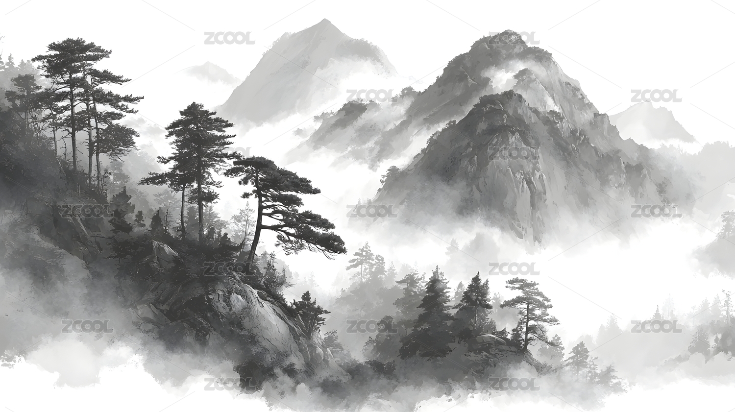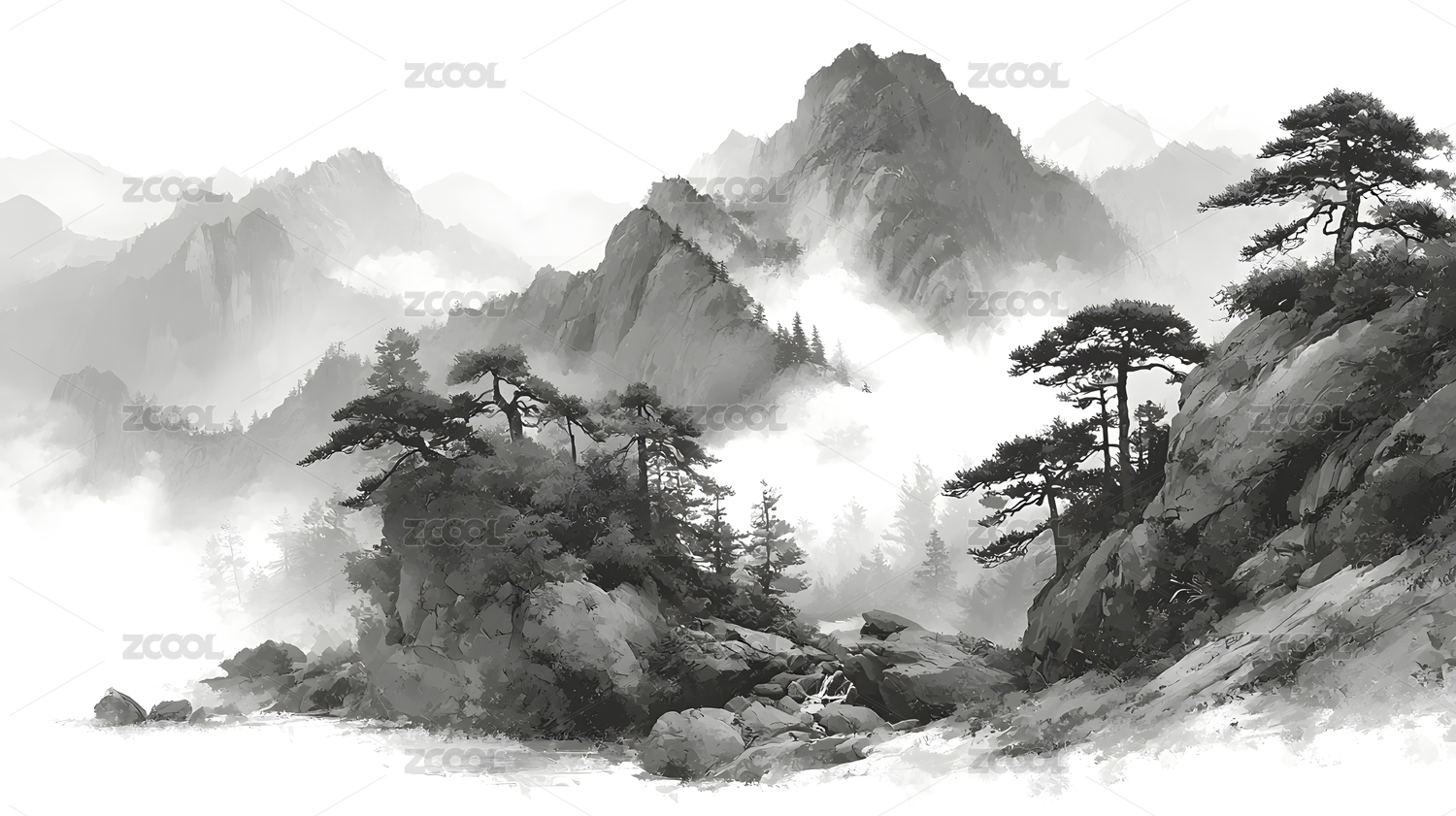 黑白中国风水墨风山水画,手绘国风意境水墨