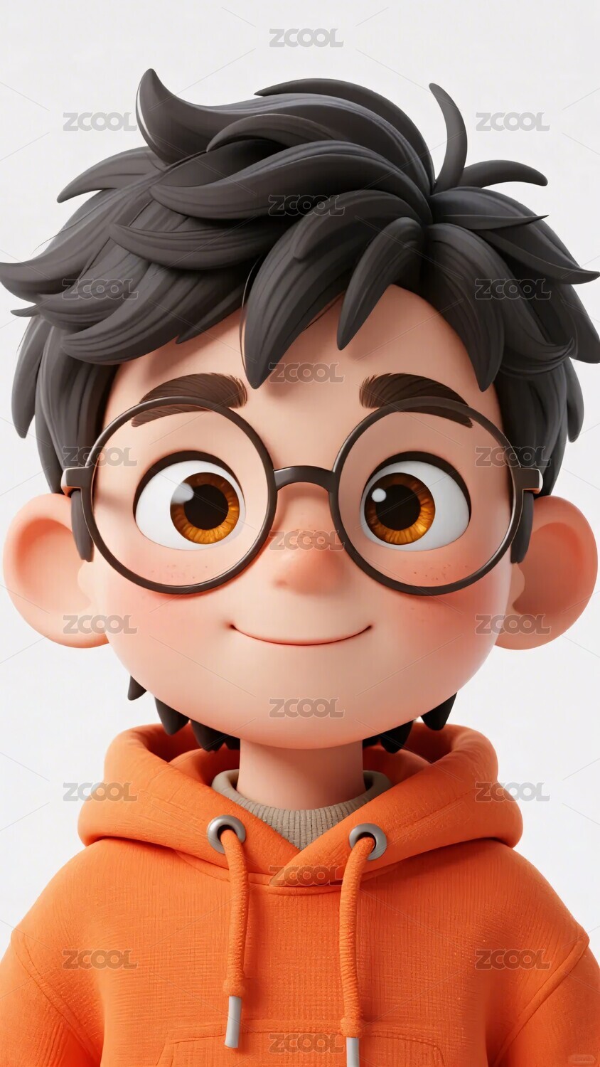 小男孩,卡通人物,眼镜,橙色,连帽衫,插画,人物形象,微笑,卷发,动画风格