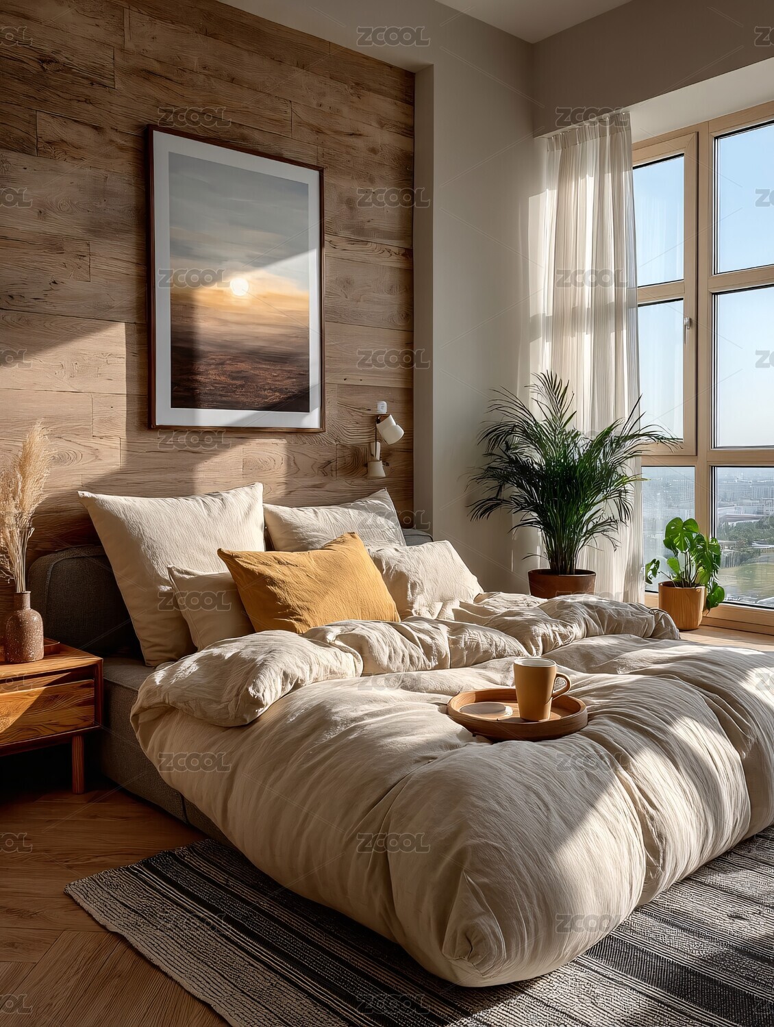 卧室,植物,挂画,木质元素,灰色调,室内设计,家居,装饰,现代风,简约