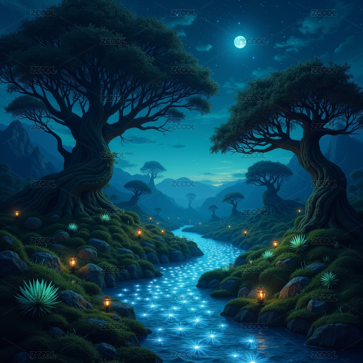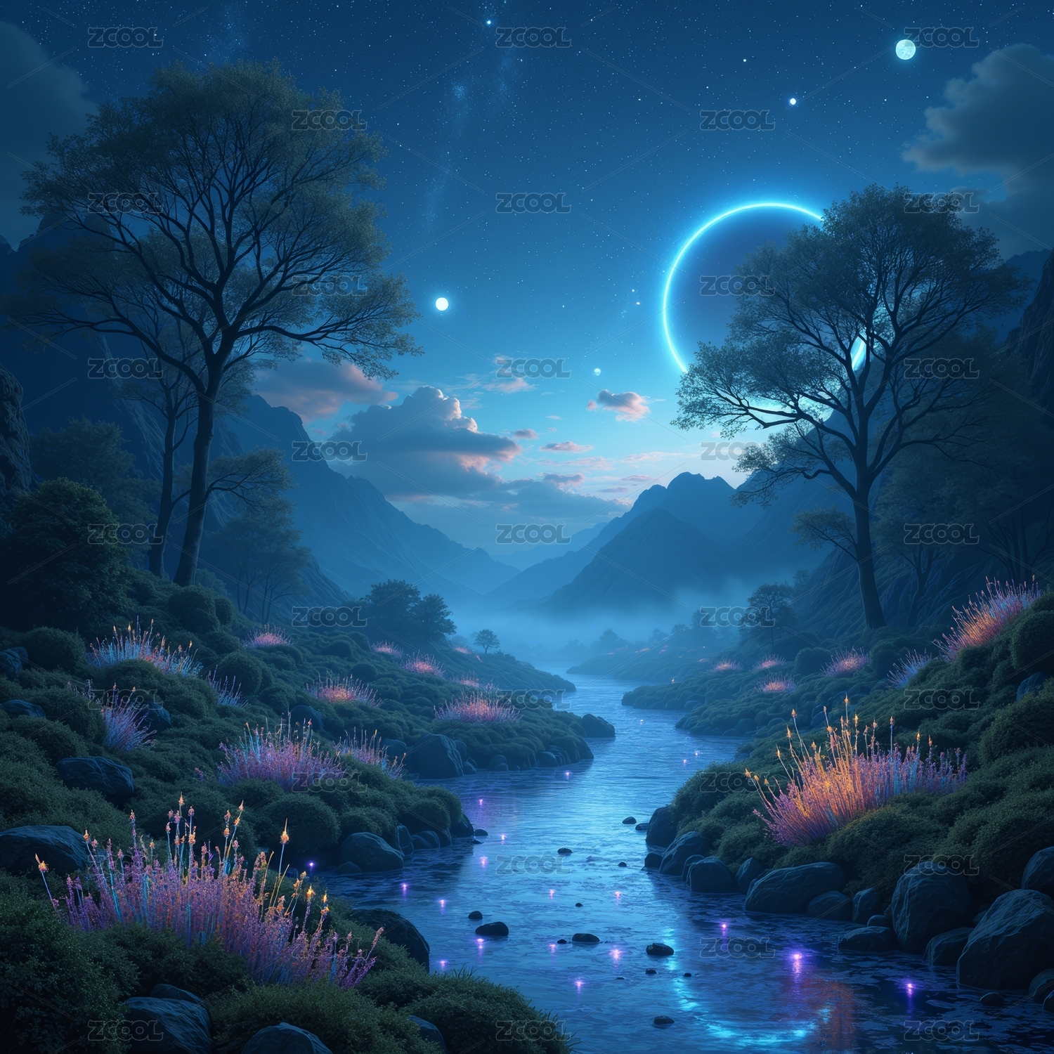 户外,自然,宁静,神秘,光影,月光,树林,溪流,蓝色,照耀
