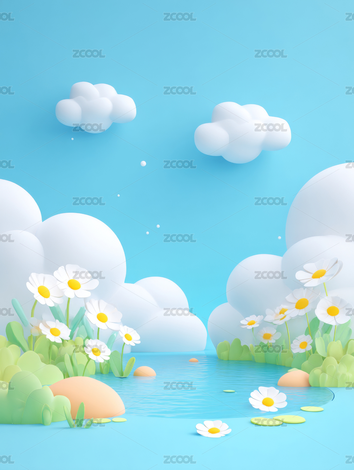 云朵,花朵,河流,蓝色,绿色,天空,卡通,梦幻,自然,背景