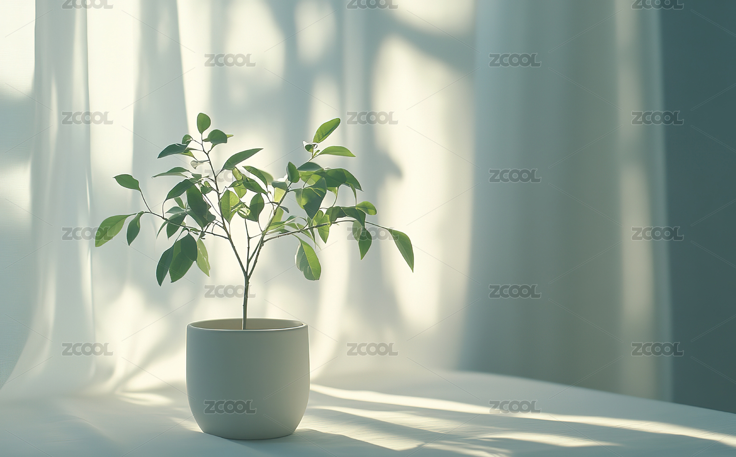 阳光透过窗帘照在盆栽上的特写