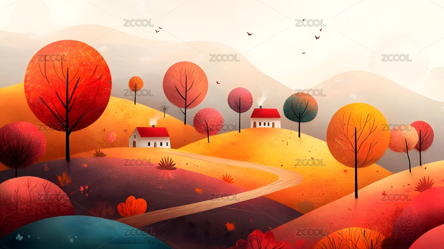 山丘房子抽象油画插画海报背景