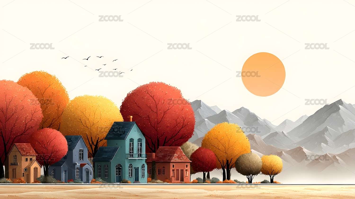 秋日村庄与远山