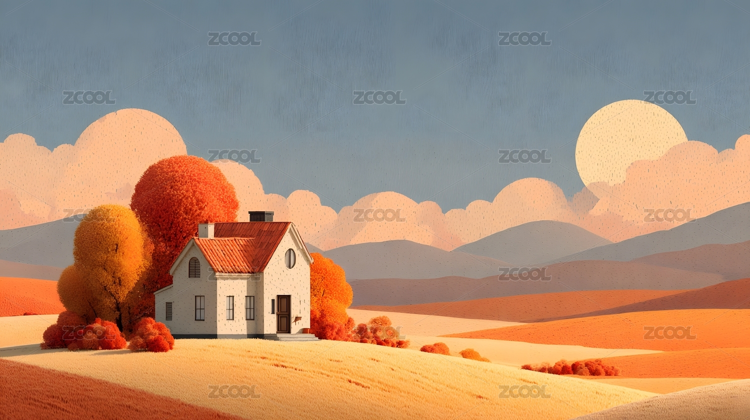 秋日小屋与圆月