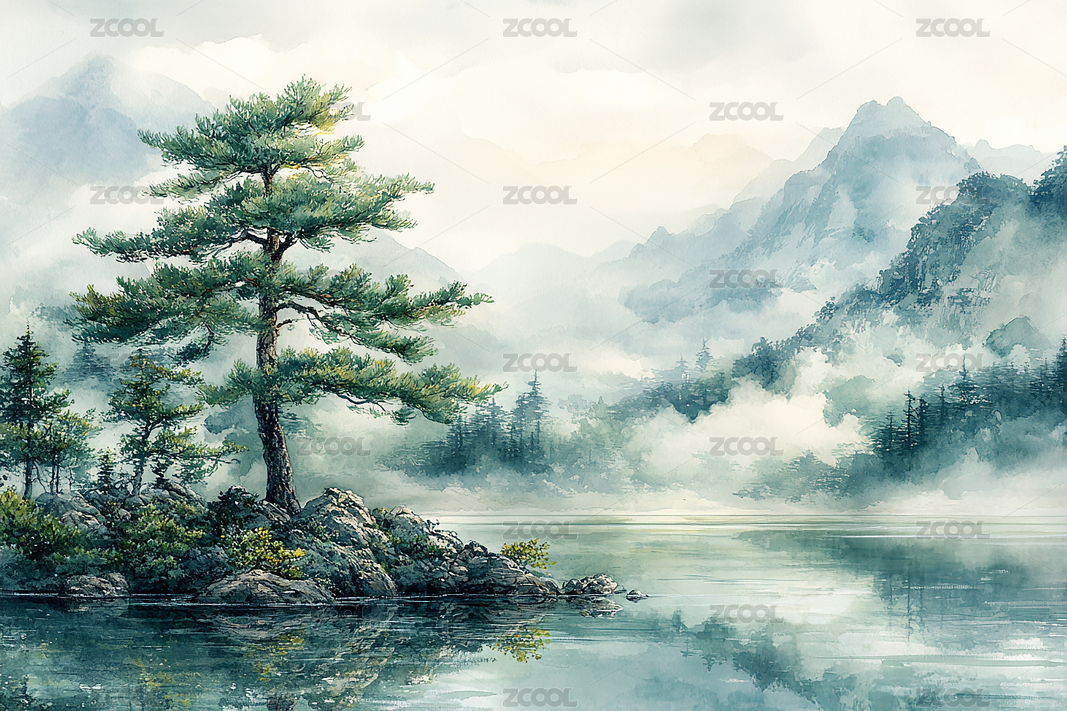 水彩风格森林湖泊风光