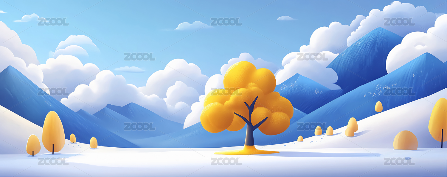树木,云朵,蓝色,冬季,雪地,卡通,简洁,自然,天空