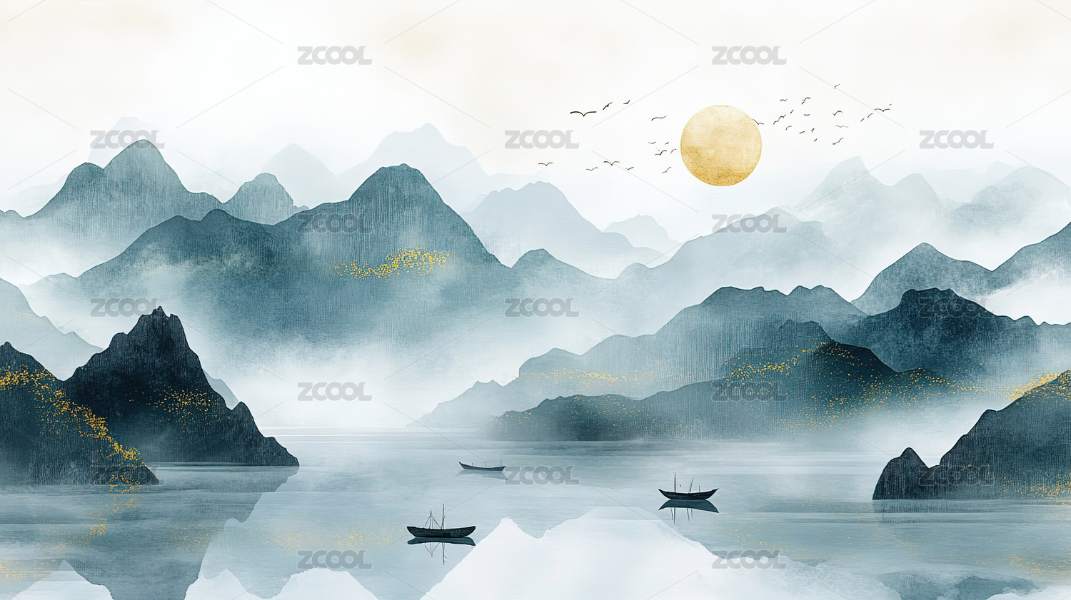 金色湖泊山峦日落