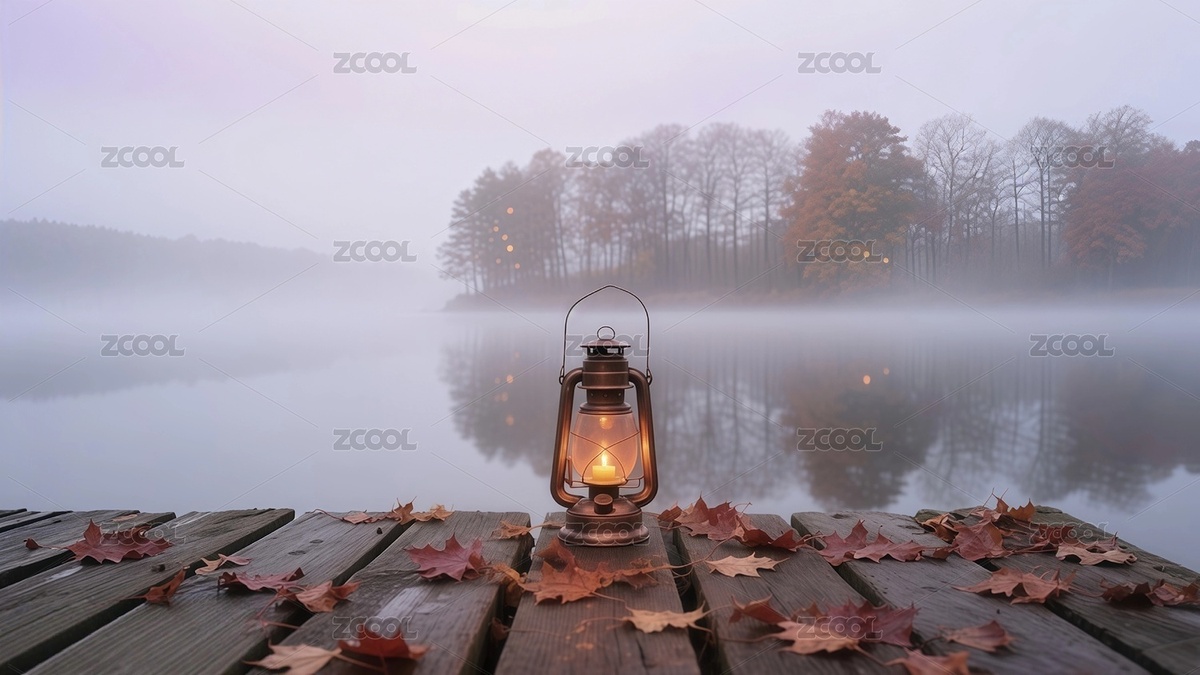 煤油灯,枫叶,木栈道,雾霭,秋天,倒影,湖面,复古,暖光,木码头