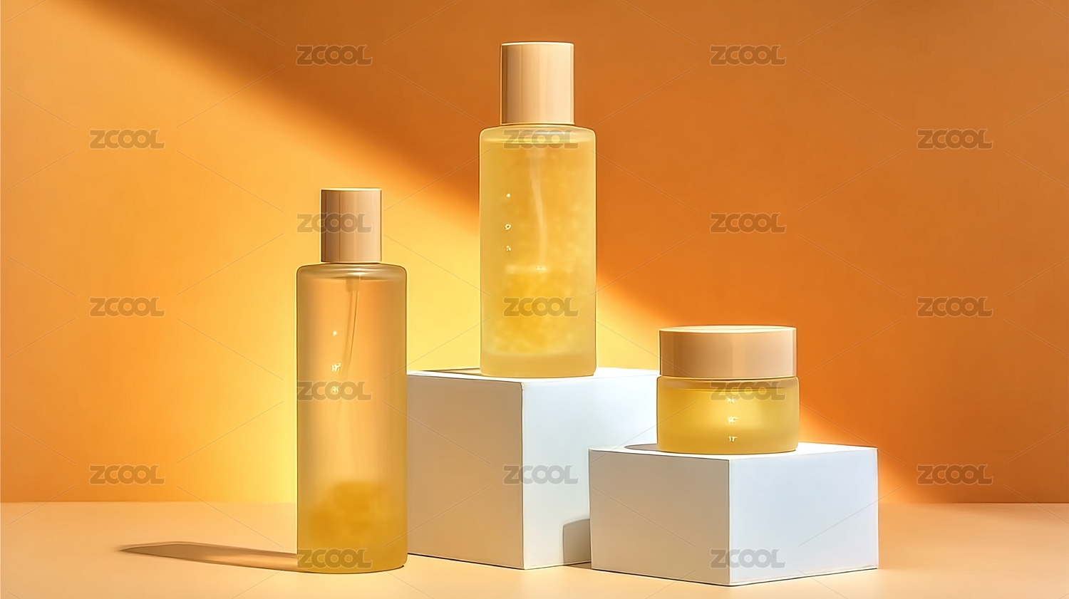三款透明瓶装护肤品置于橙色背景的白色展台