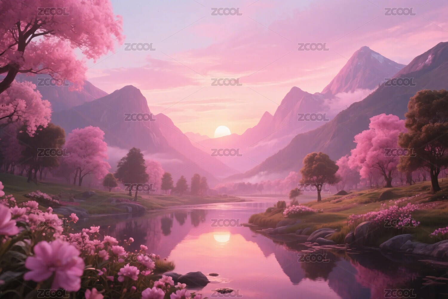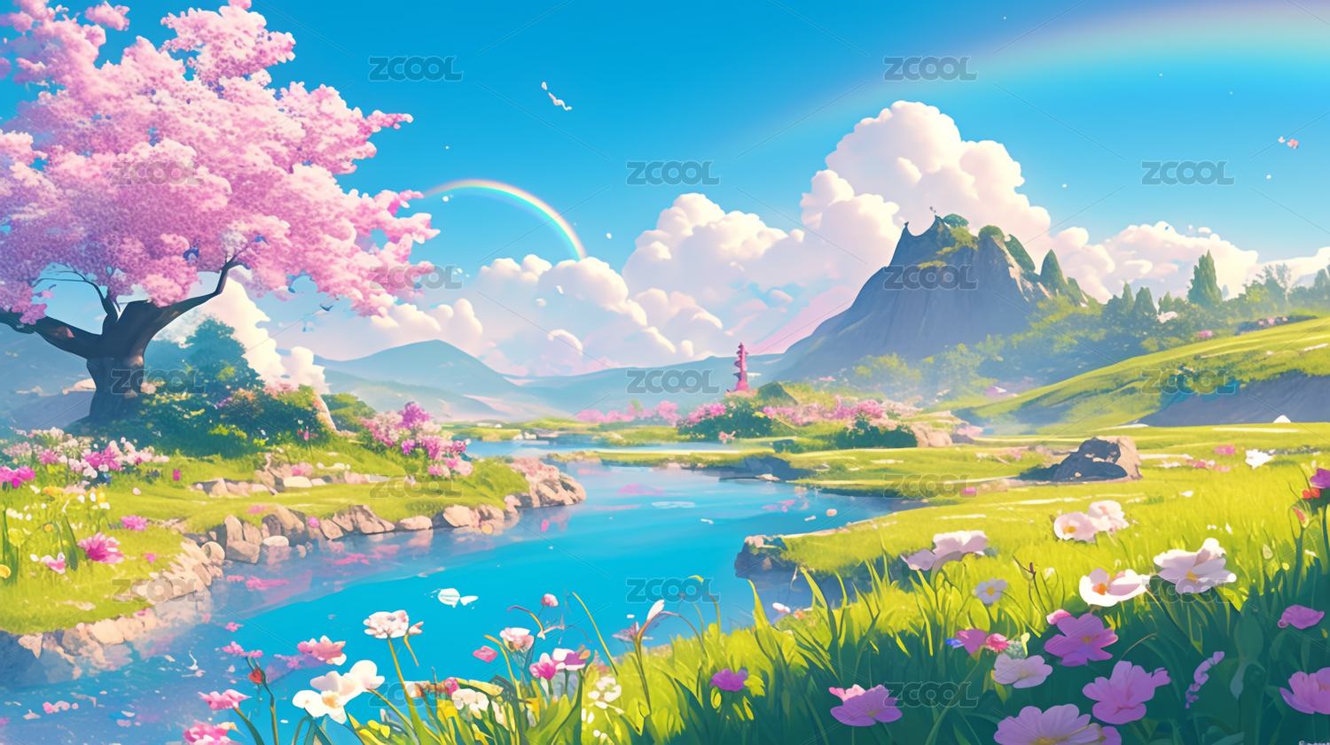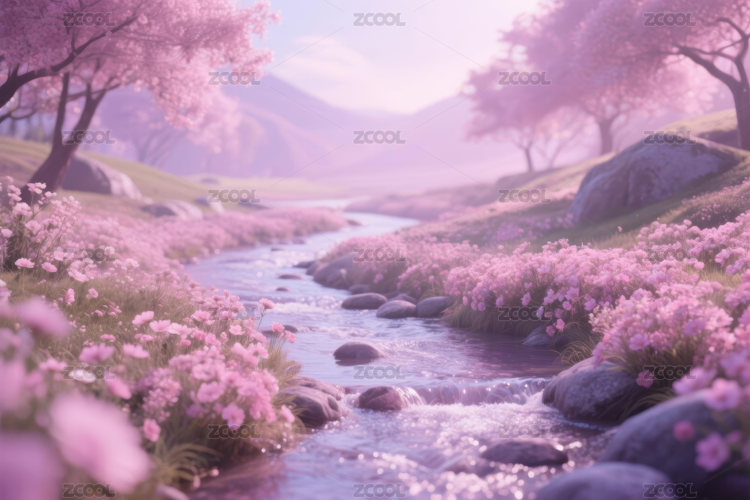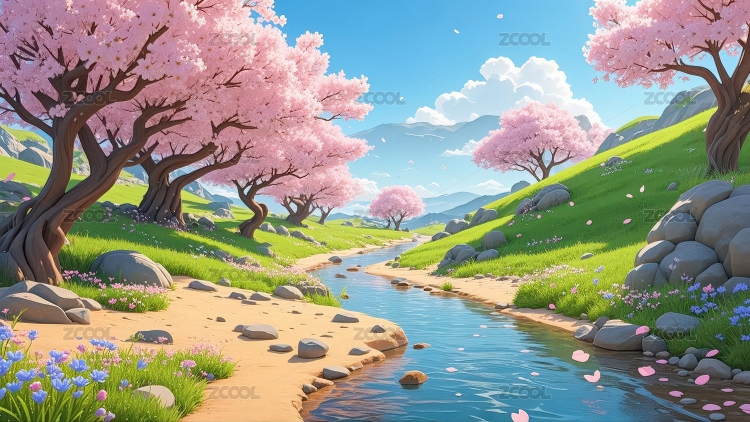 山水,瀑布,樱花,森林,花朵,青山,蓝天,溪流,插画,矢量