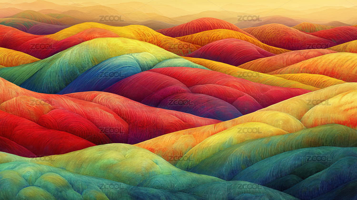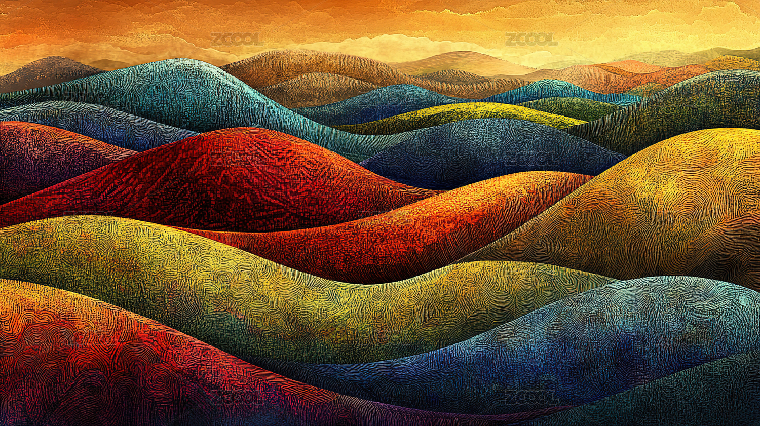 色彩丰富的田园风光蜡笔画插画