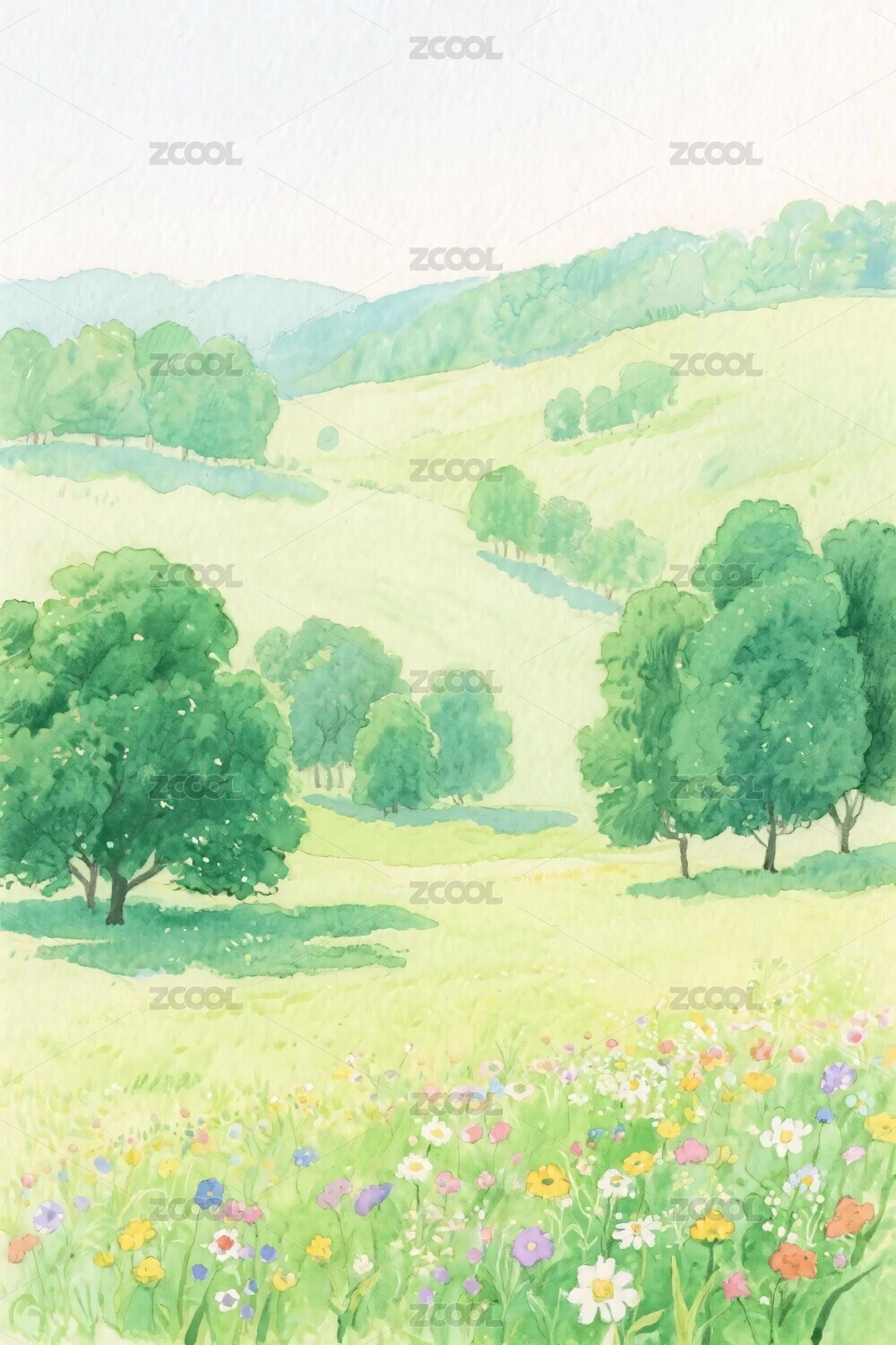 草地,野花,树木,蓝天,春景,风景,自然,花草,田园,乡村